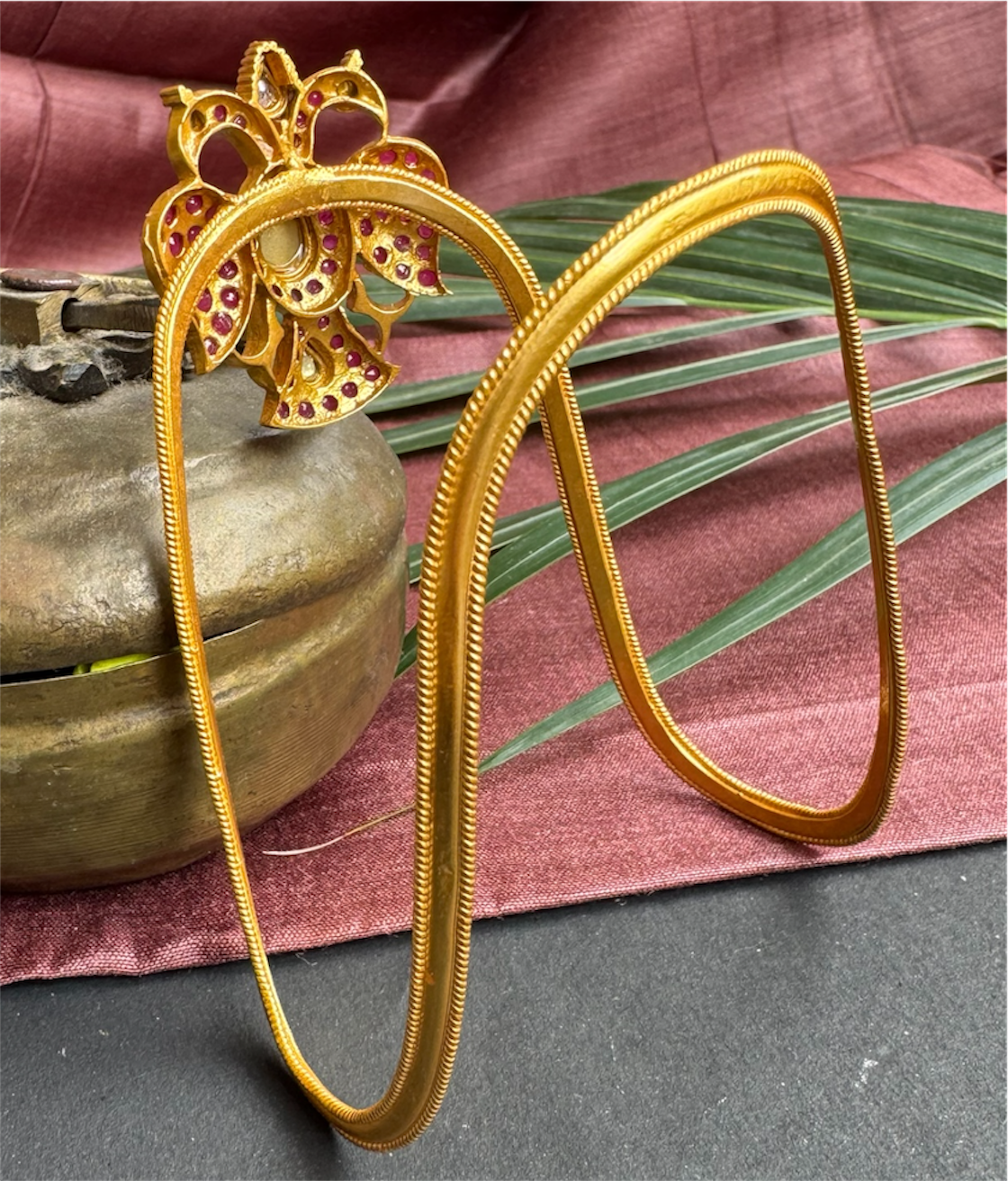 A masterpiece of heritage and craftsmanship, this stunning Vanki revives the elegance of ancient South Indian artistry. Meticulously handcrafted in Sterling (92.5%) Silver and enriched with a gold-dipped antique finish, its distinctive V-shape ensures a perfect, adjustable fit. The shape of the Vanki is a V which ensures that it can be adjusted to any arm size.
