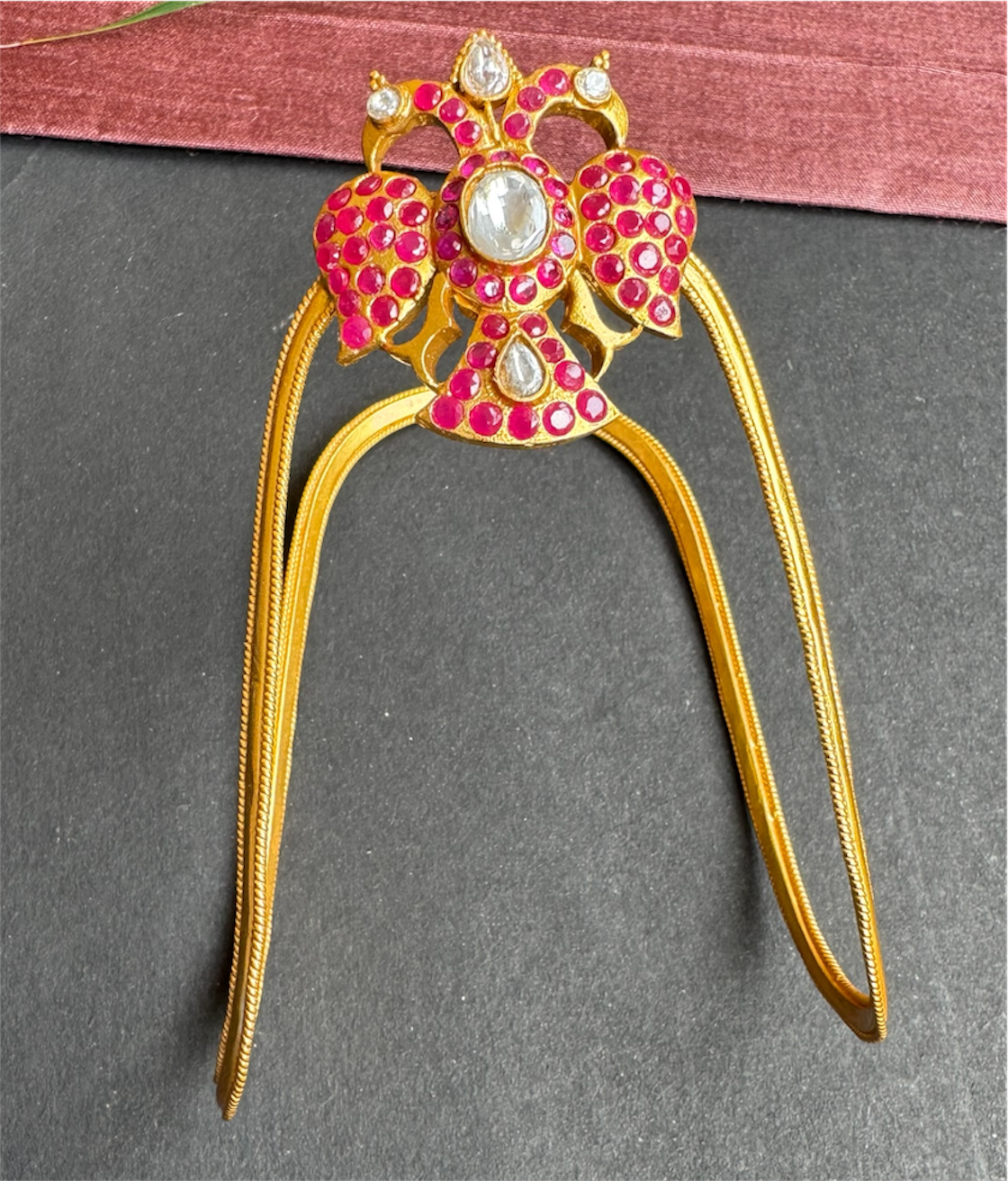 A heirloom statement piece, and a KO original design this is a stunning Vanki . A gorgeous recreation of a classic heritage design, this Vanki (armlet) features the powerful Gandaberunda motif, symbolizing strength and protection. An exclusive KO original, the piece is handcrafted using ancient South Indian jewelry techniques in Sterling (92.5%) Silver and finished with a special gold-dipped process to create a rich antique look. The iconic V-shape ensures a comfortable, adjustable fit for any arm size while the redand white polki stones add a stunning look. A timeless expression of tradition, craftsmanship, and enduring beauty.
