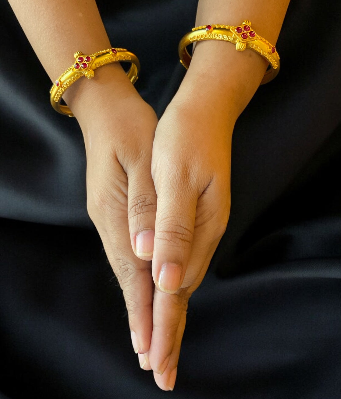 Intricate detailing and tiny kempu stones make this bracelet an irresistable accessory.This design is a staple of Kodava traditional jewellery. Handcrafted with care in Sterling Silver (92.5%) using techniques used in ancient South Indian antique jewellery the bracelet is gold-dipped in a special process to give an antique look.This is a kada with a screw that can be opened.