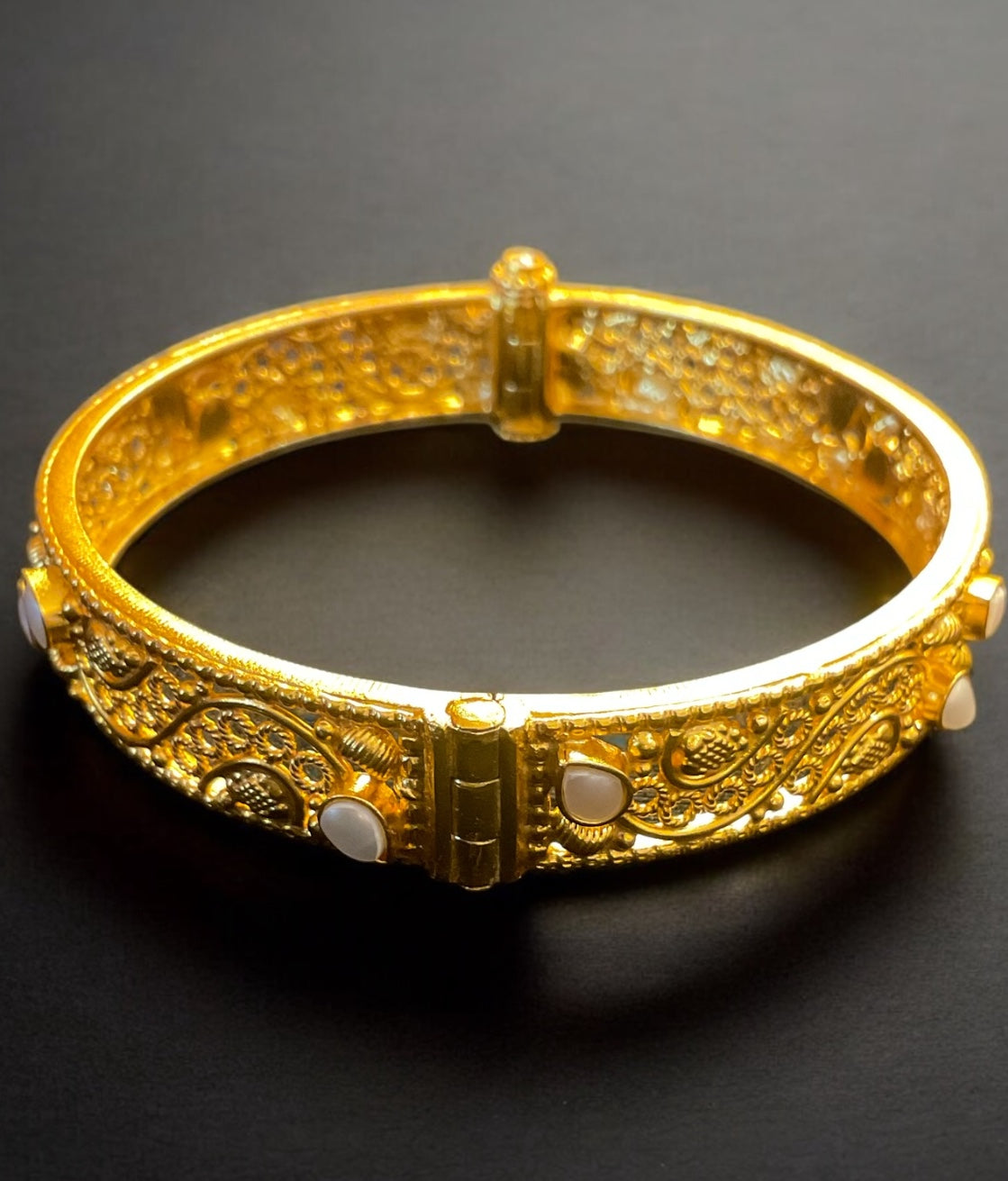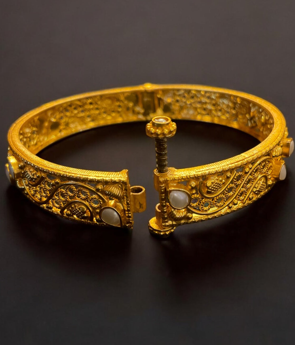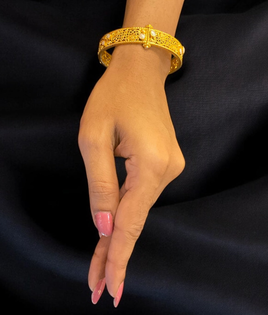 This gorgeous kada , crafted from high-quality 92.5% sterling silver and dipped in 24 K gold, features an intricate filigree design which is further adorned with lustrous pearl that makes it look dreamy .