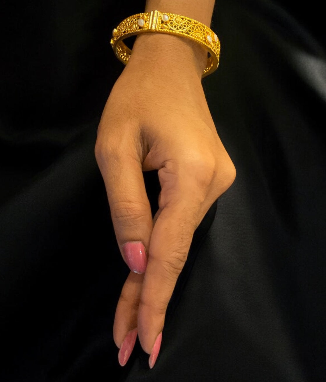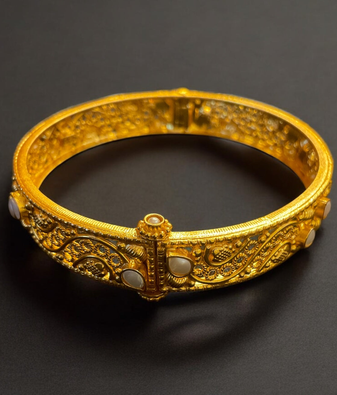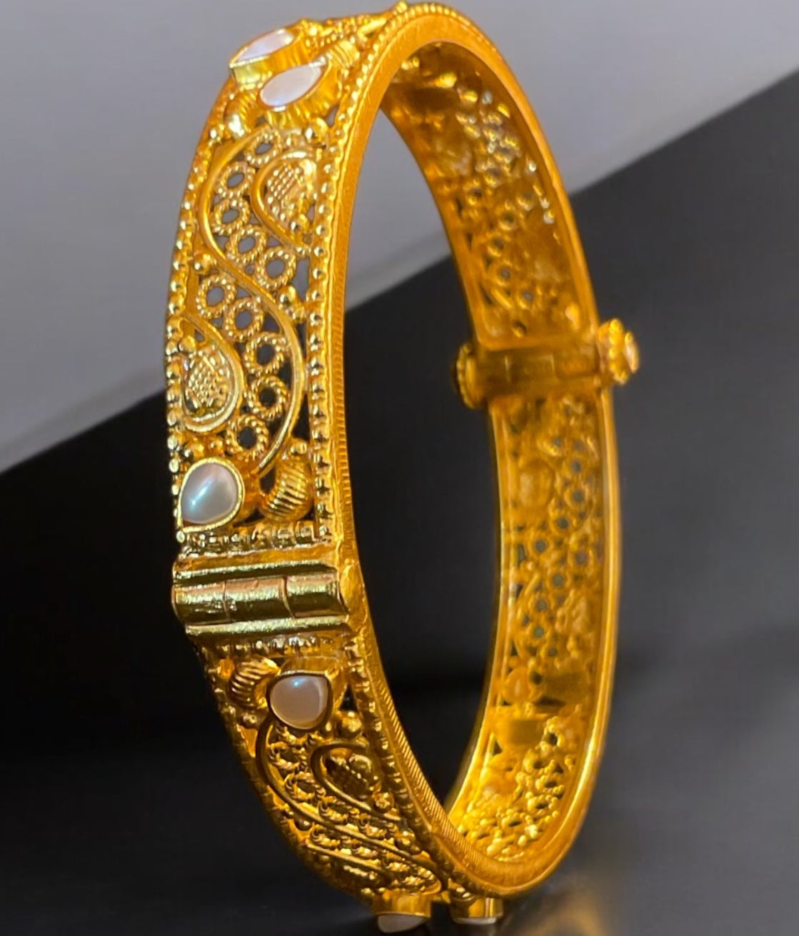 This gorgeous kada , crafted from high-quality 92.5% sterling silver and dipped in 24 K gold, features an intricate filigree design which is further adorned with lustrous pearl that makes it look dreamy .