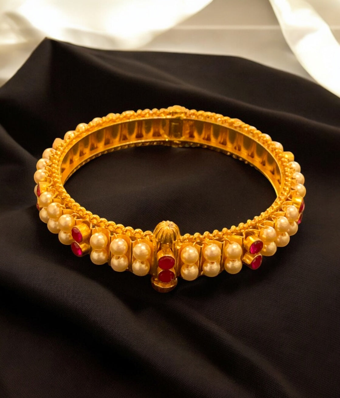 Pearl kadas or bracelets have been an important part of Indian heritage jewelry, symbolizing elegance and tradition. Adding a regal charm Pearl bangles are a cherished piece in every jewelry collection.