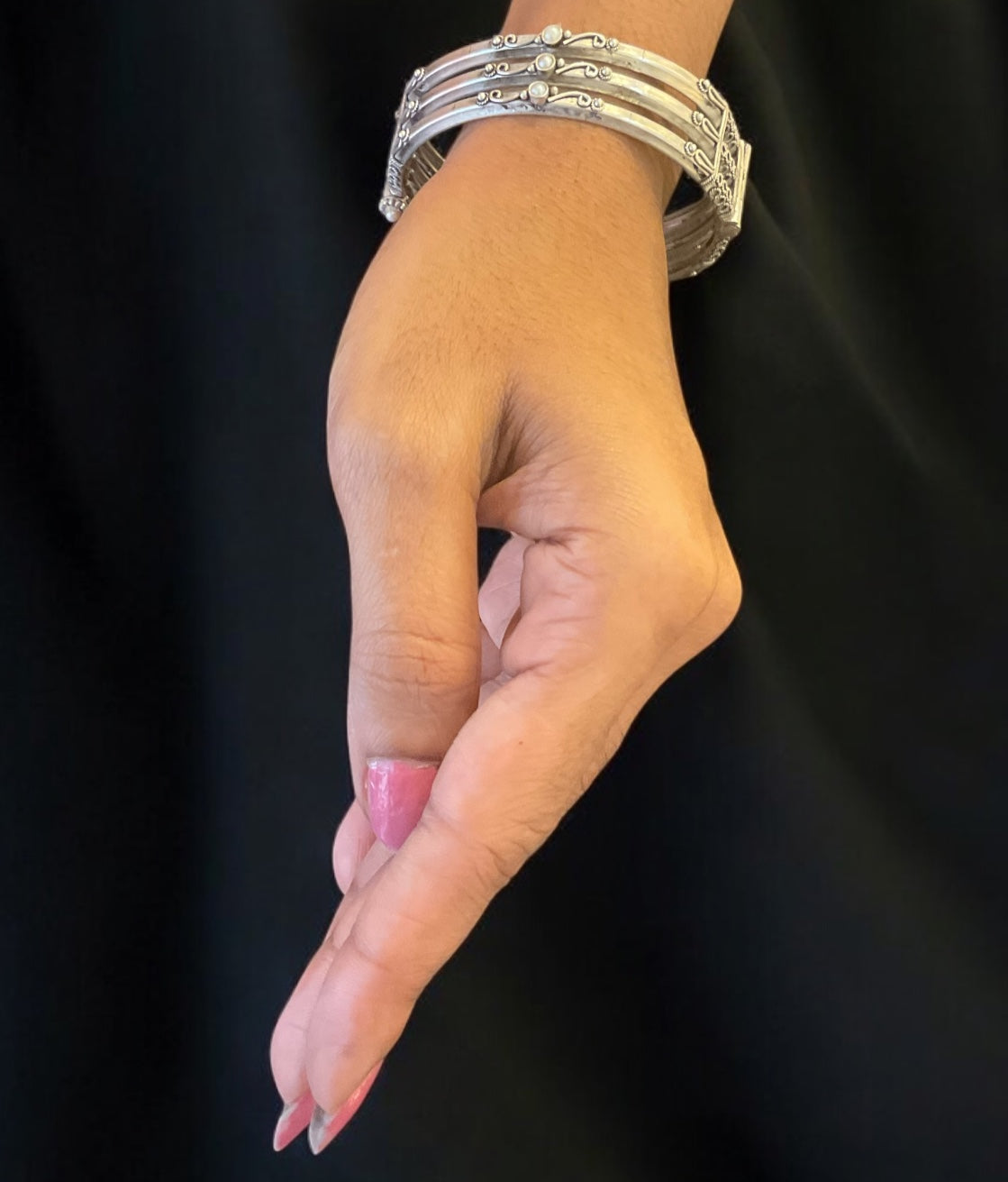Expertly handcrafted in Sterling Silver (92.5%) using age-old techniques passed down through generations, each kada is oxidised through a special process to achieve a rich, antique finish. The screw mechanism makes it easy to wear while preserving its traditional form.