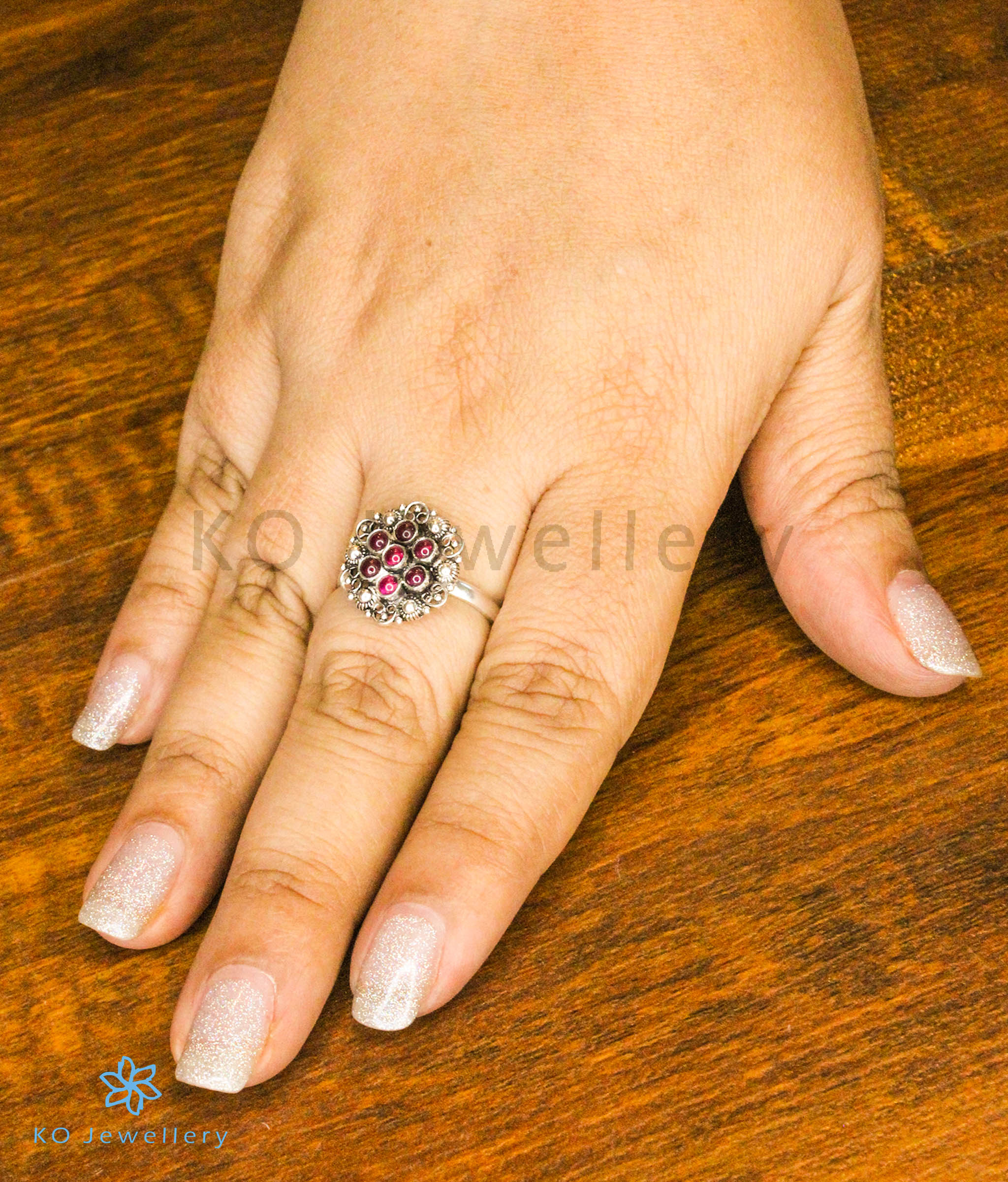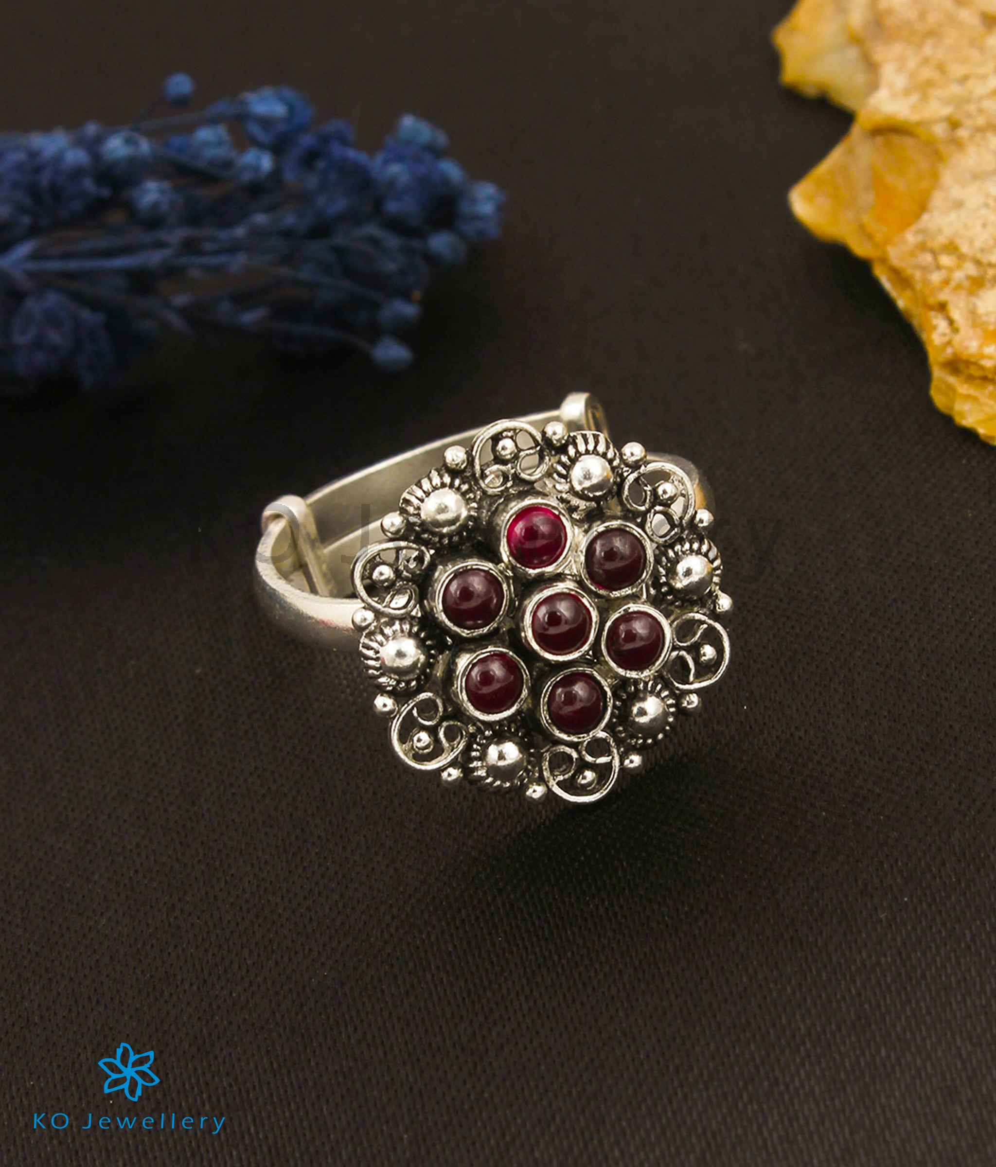 This ornate kempu stone finger ring is truly a head-turner.Crafted using techniques used in ancient South Indian antique gold temple jewellery the entire piece is crafted in pure Sterling Silver (92.5%) and gold dipped . This ring is adjustable according to the size of your finger.