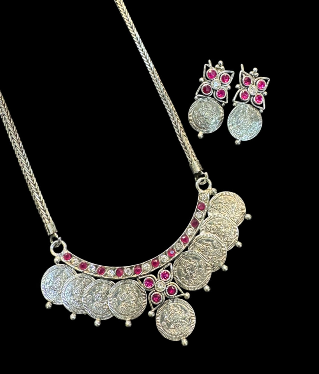 The Mudra Silver Lakshmi Kasumala Necklace & Earrings (Oxidised)