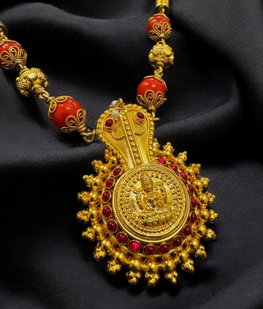 The pendant itself is a masterpiece of craftsmanship. It features a traditional round shape, crowned with a stylized cobra hood, a powerful symbol of fertility and protection. The cobra’s eyes are set with kemp stone adding a touch of vibrancy and elegance. At the heart of the pendant is the divine image of Goddess Lakshmi, embodying prosperity and blessings.