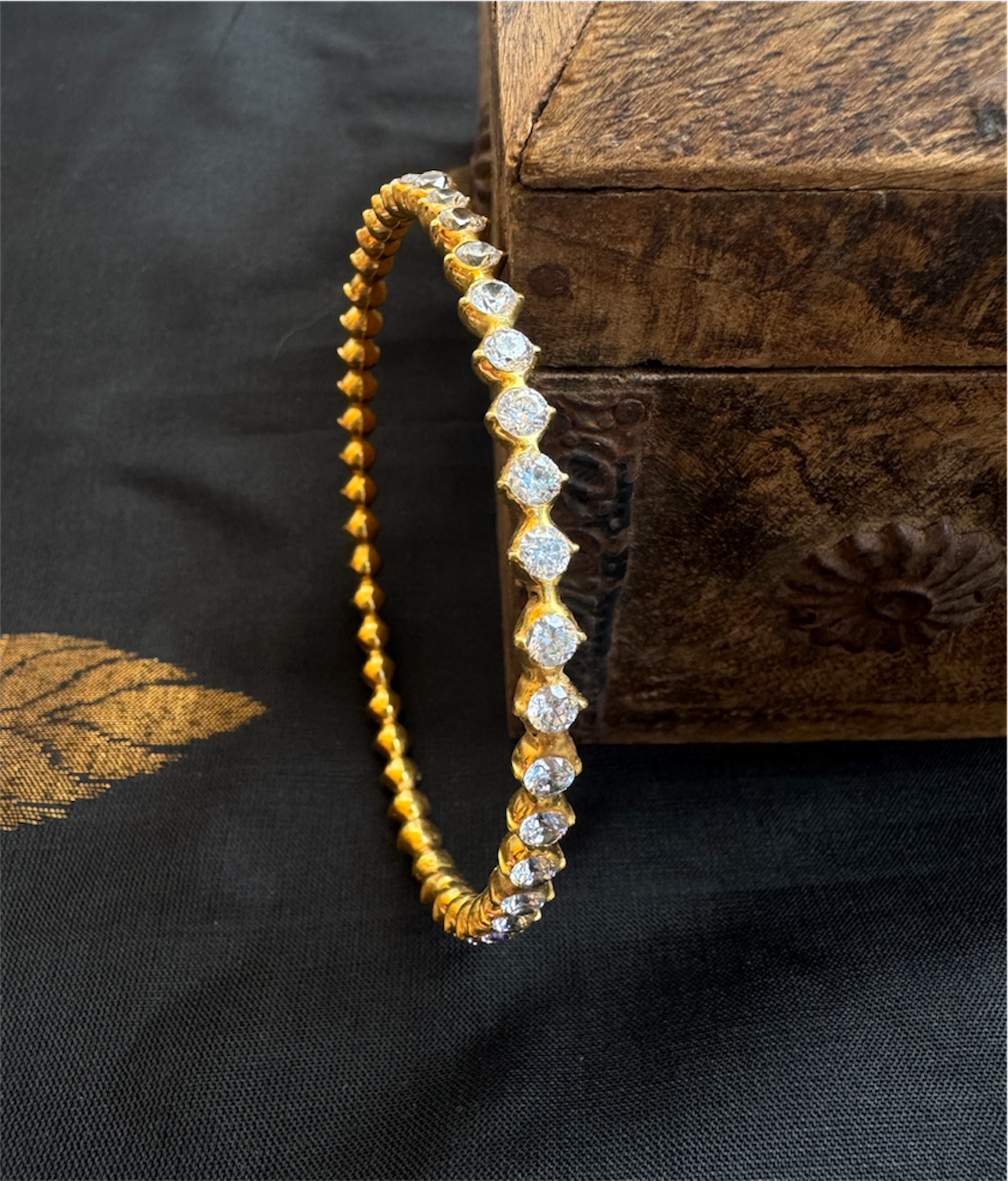 Adorned with AAA+ quality Cubic Zircon, the bangle radiates a diamond-like brilliance that captivates instantly. Meticulously handcrafted in 92.5 Sterling Silver, it features a flawless, continuous pattern that showcases extraordinary precision, artistry, and attention to detail. The piece is further gold-dipped using a special process, adding a rich, luxurious finish to its radiant appeal.