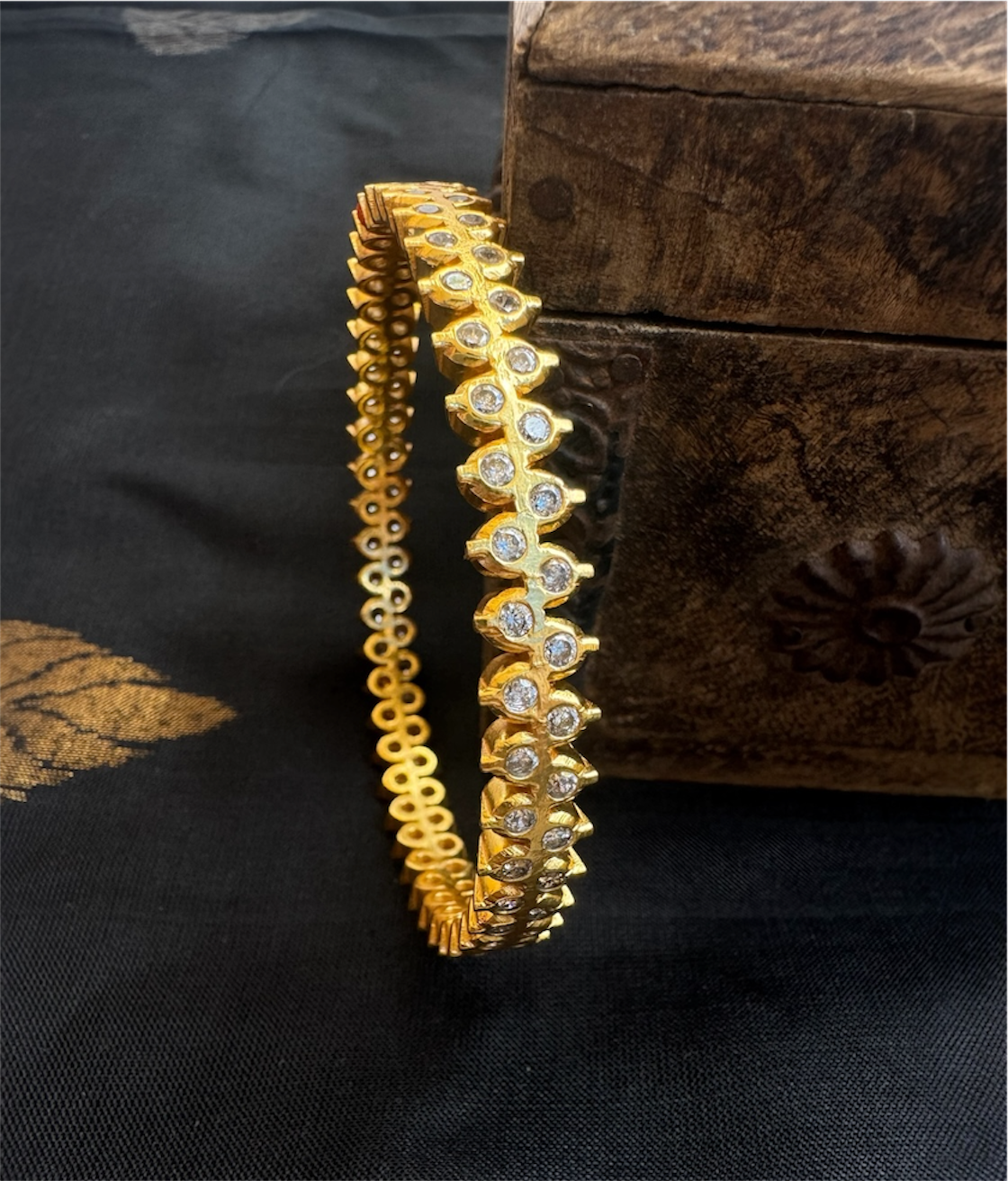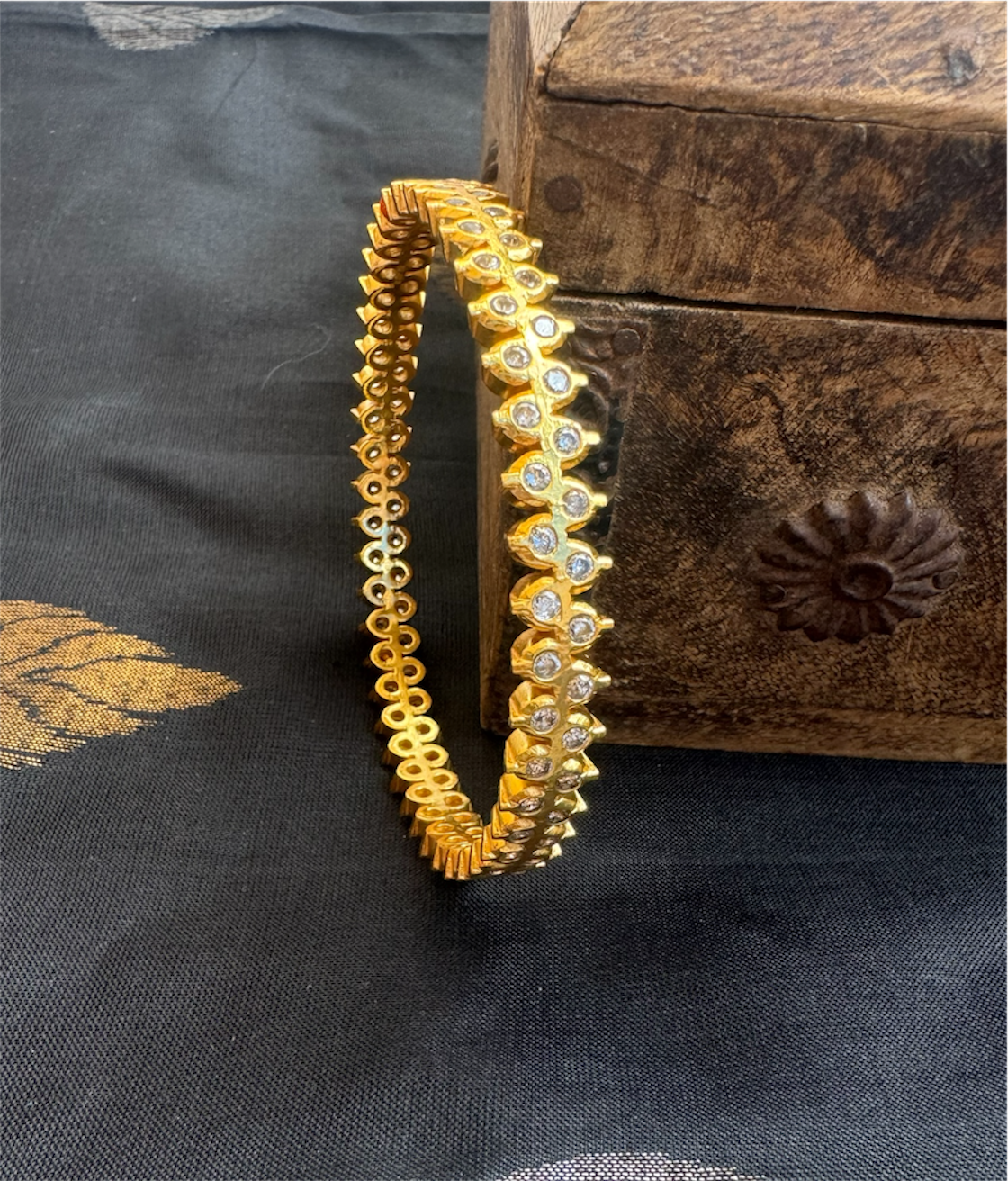 Adorned with AAA+ quality Cubic Zircon, the bangle radiates a diamond-like brilliance that captivates instantly. Meticulously handcrafted in 92.5 Sterling Silver, it features a flawless, continuous pattern that showcases extraordinary precision, artistry, and attention to detail. The piece is further gold-dipped using a special process, adding a rich, luxurious finish to its radiant appeal.