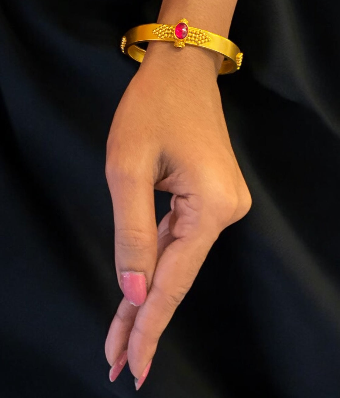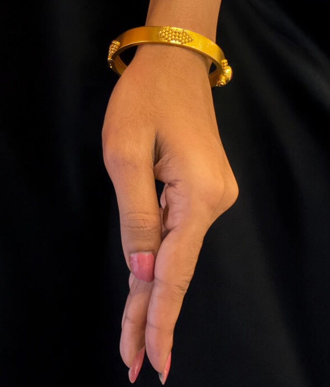 Handmade using the age-old techniques of temple jewelry, each kada is a testament to superior craftsmanship, created with care and dedication. Whether worn for a special occasion or as a daily statement piece, this bracelet is sure to captivate with its beauty and craftsmanship.