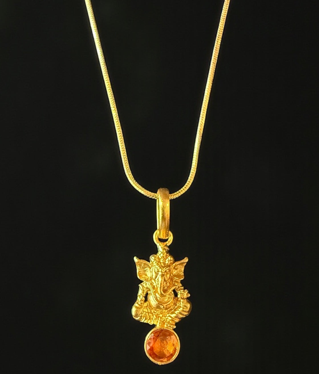 The pendant features an intricately sculpted form of Lord Ganesha, symbolizing wisdom, prosperity, and protection. Each detail is carefully hand-finished by skilled artisans, giving the piece a refined temple-jewellery character that stands out in both daily wear and festive occasions.