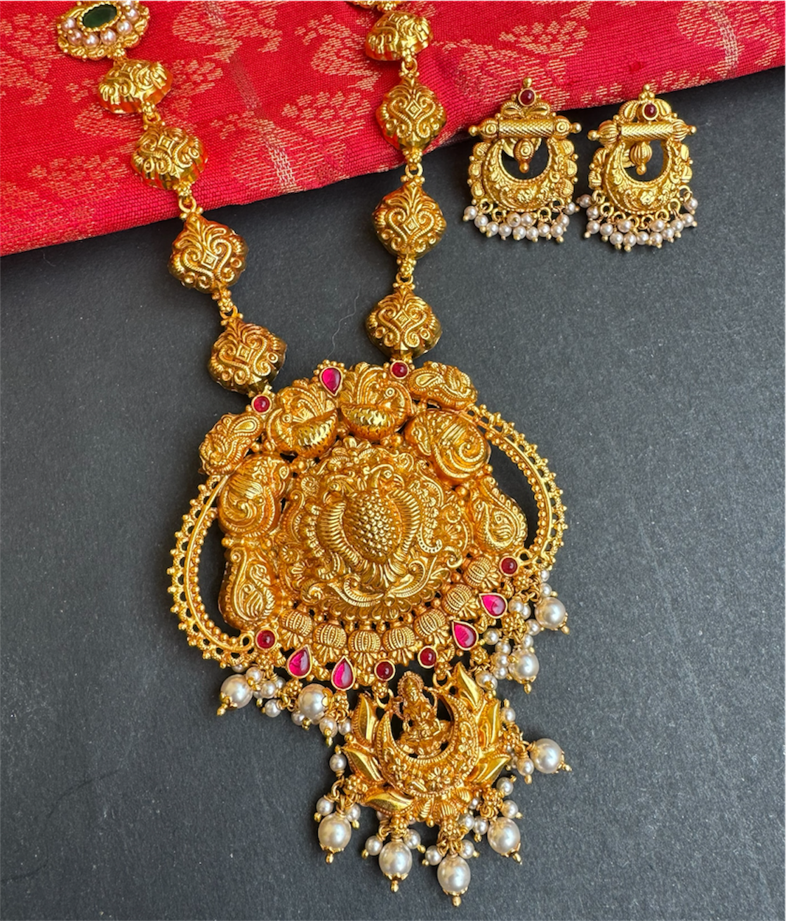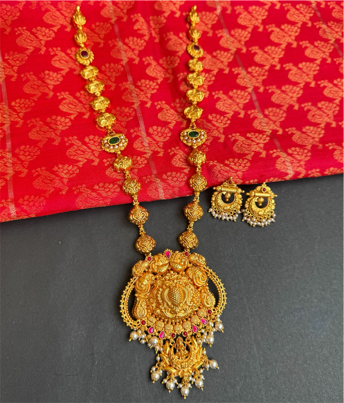 The necklace also features a beautifully sculpted peacock motifs —an enduring symbol of beauty, grace, and auspicious beginnings. Each detail is brought to life with traditional Nakshi craftsmanship, giving the piece an antique, temple-inspired character. Vibrant kemp stones are intricately set throughout, adding depth, colour, and the unmistakable charm of classical South Indian jewellery.
