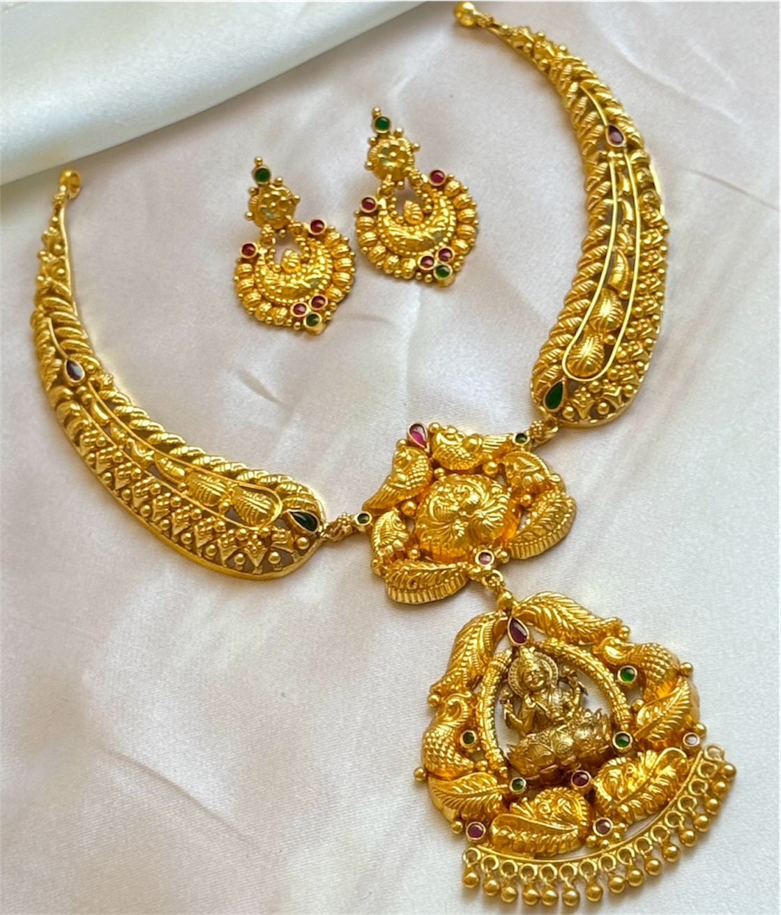This exquisite necklace features a detailed Lakshmi motif at the centre, symbolising prosperity, grace, and divine abundance. Surrounding the goddess is an elegant peacock-themed border, meticulously carved to highlight the beauty of flowing feathers and traditional temple artistry.