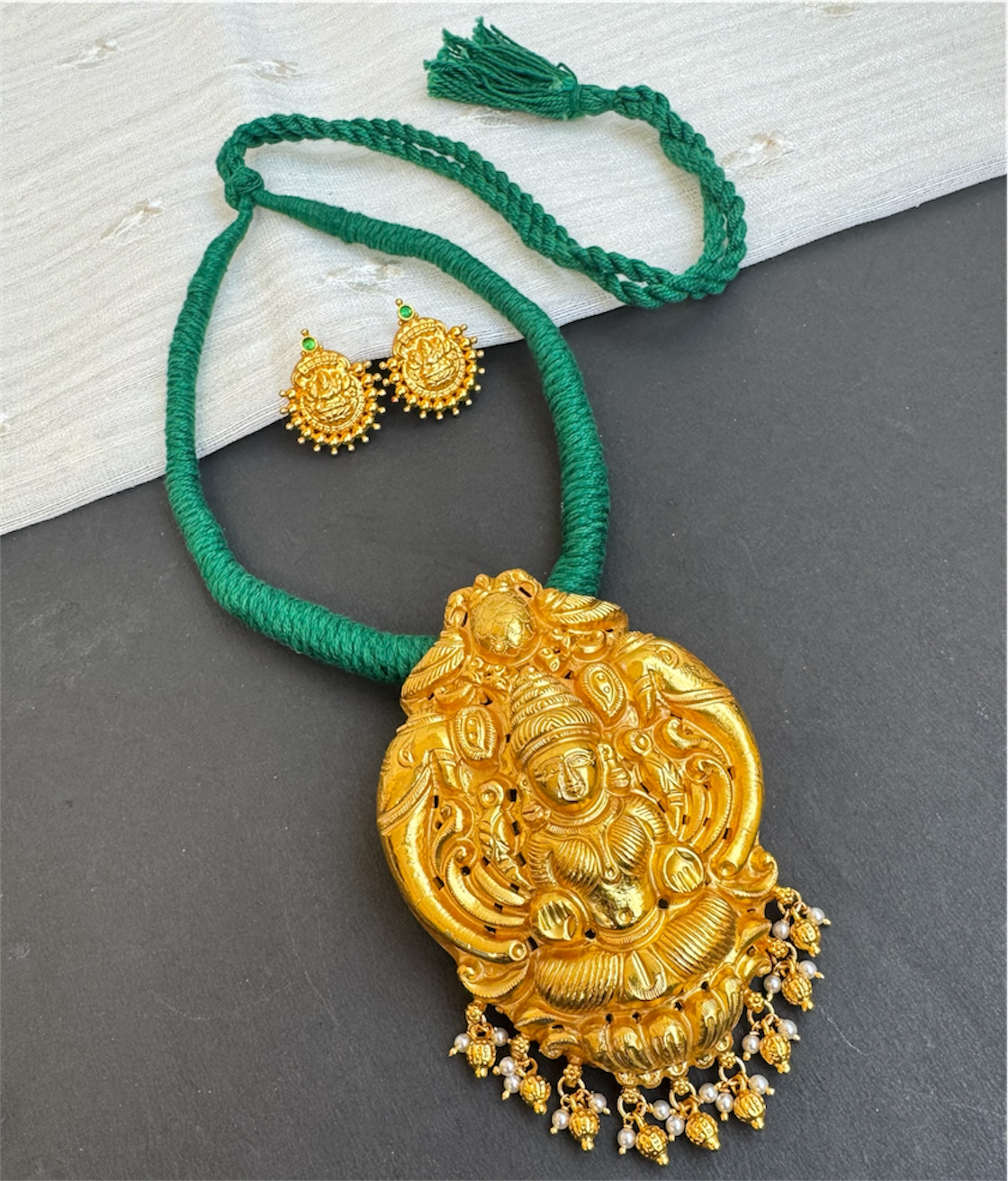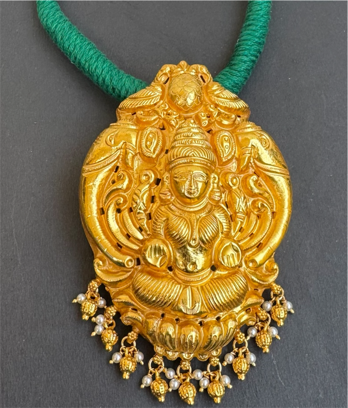 Rooted in tradition and timeless craftsmanship, this Lakshmi pendant set draws inspiration from ancient South Indian temple jewellery. Handcrafted using age-old techniques once reserved for antique gold ornaments, the design beautifully reflects the grace and prosperity associated with Goddess Lakshmi.