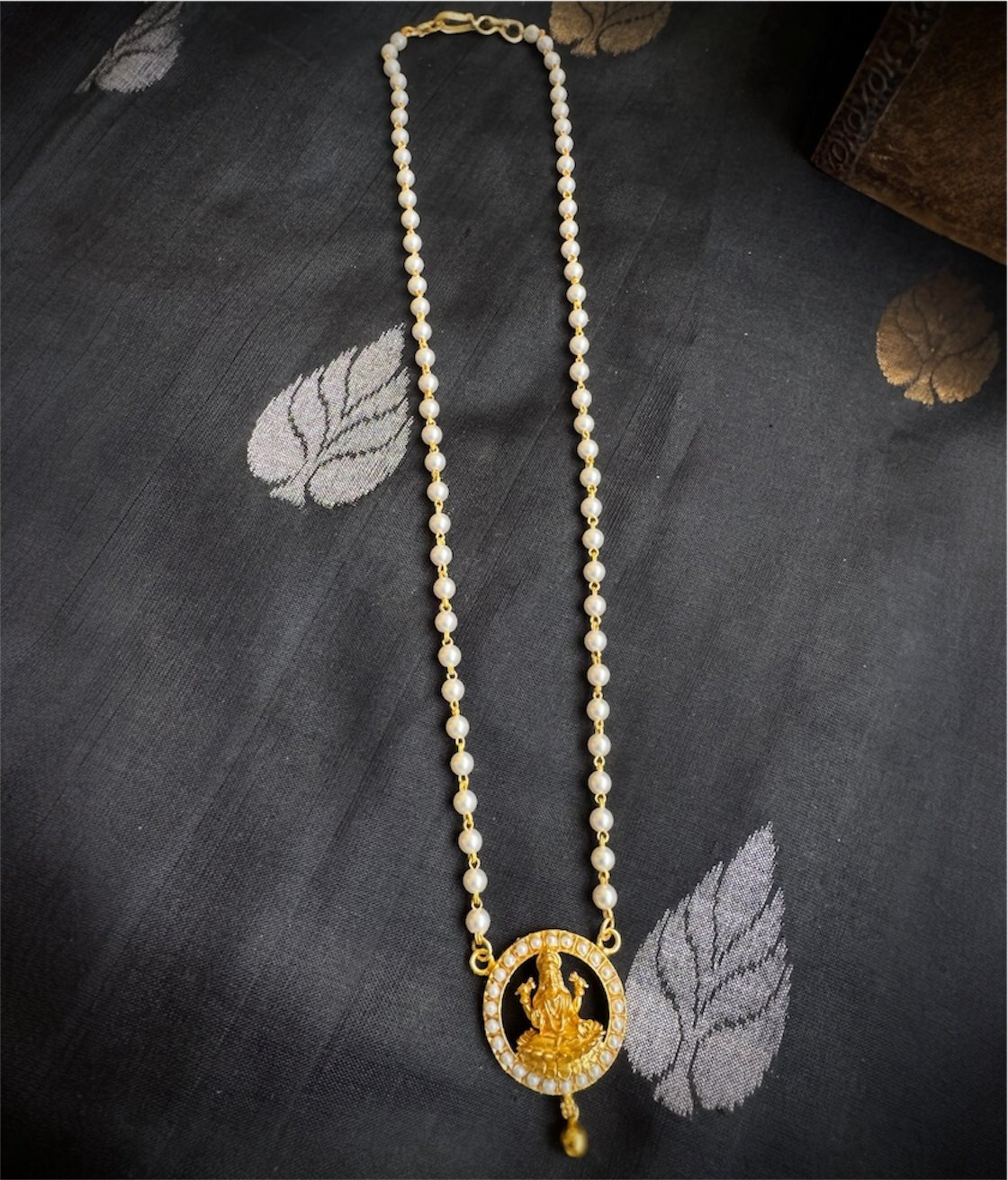 The necklace is gracefully accented with delicate pearls, creating a classic temple-inspired look that is both regal and refined. Perfectly balancing tradition with versatility, this piece pairs effortlessly with ethnic attire, festive wear, or even contemporary outfits for a statement of understated luxury. The set is completed with matching Lakshmi motif earrings, making it an ideal choice for weddings, celebrations, and special occasions.