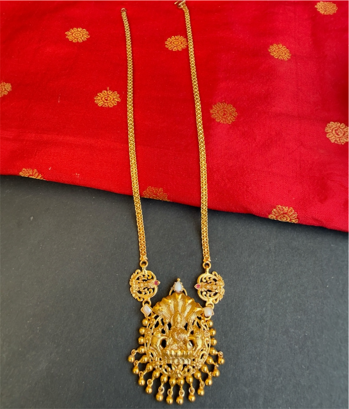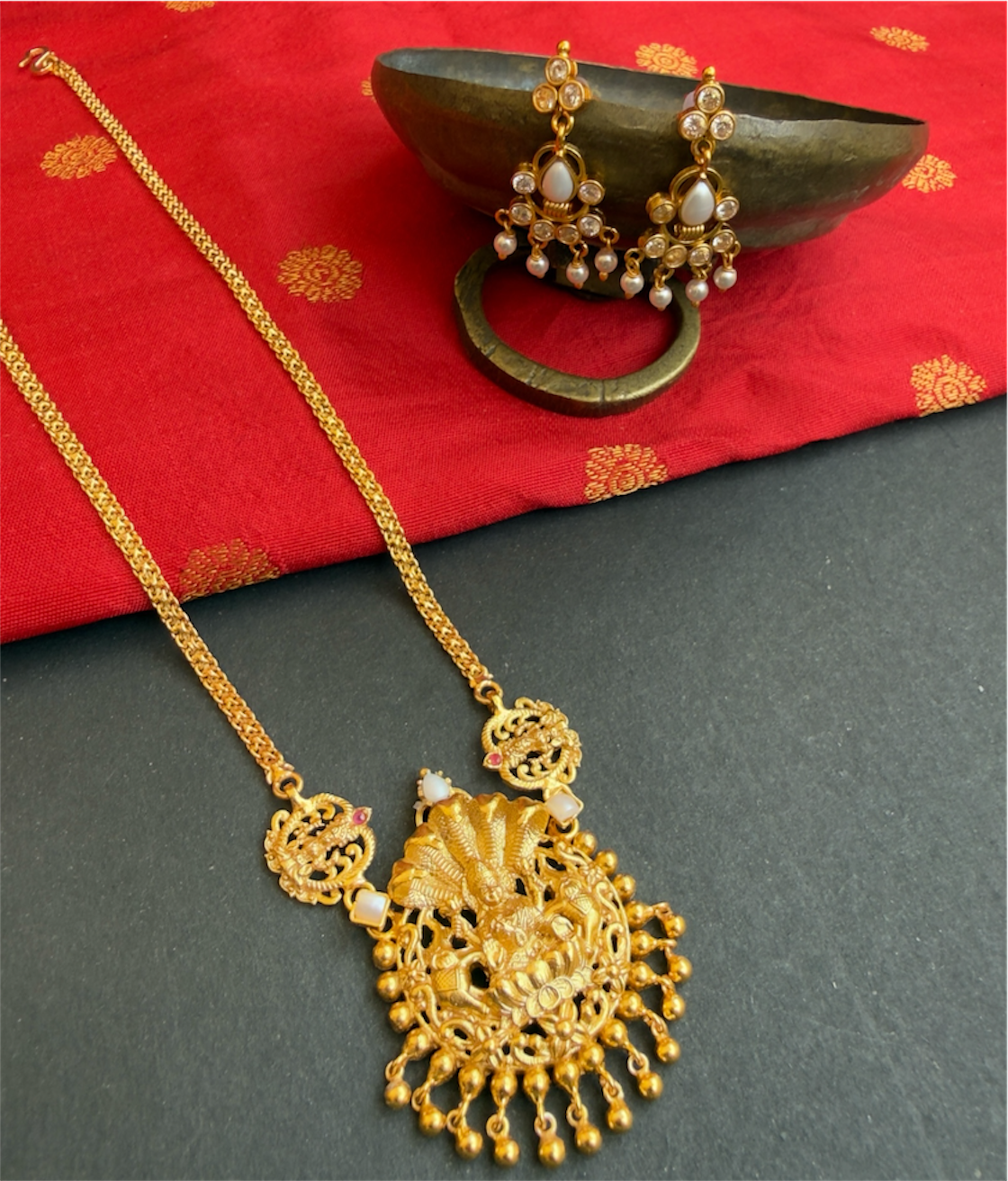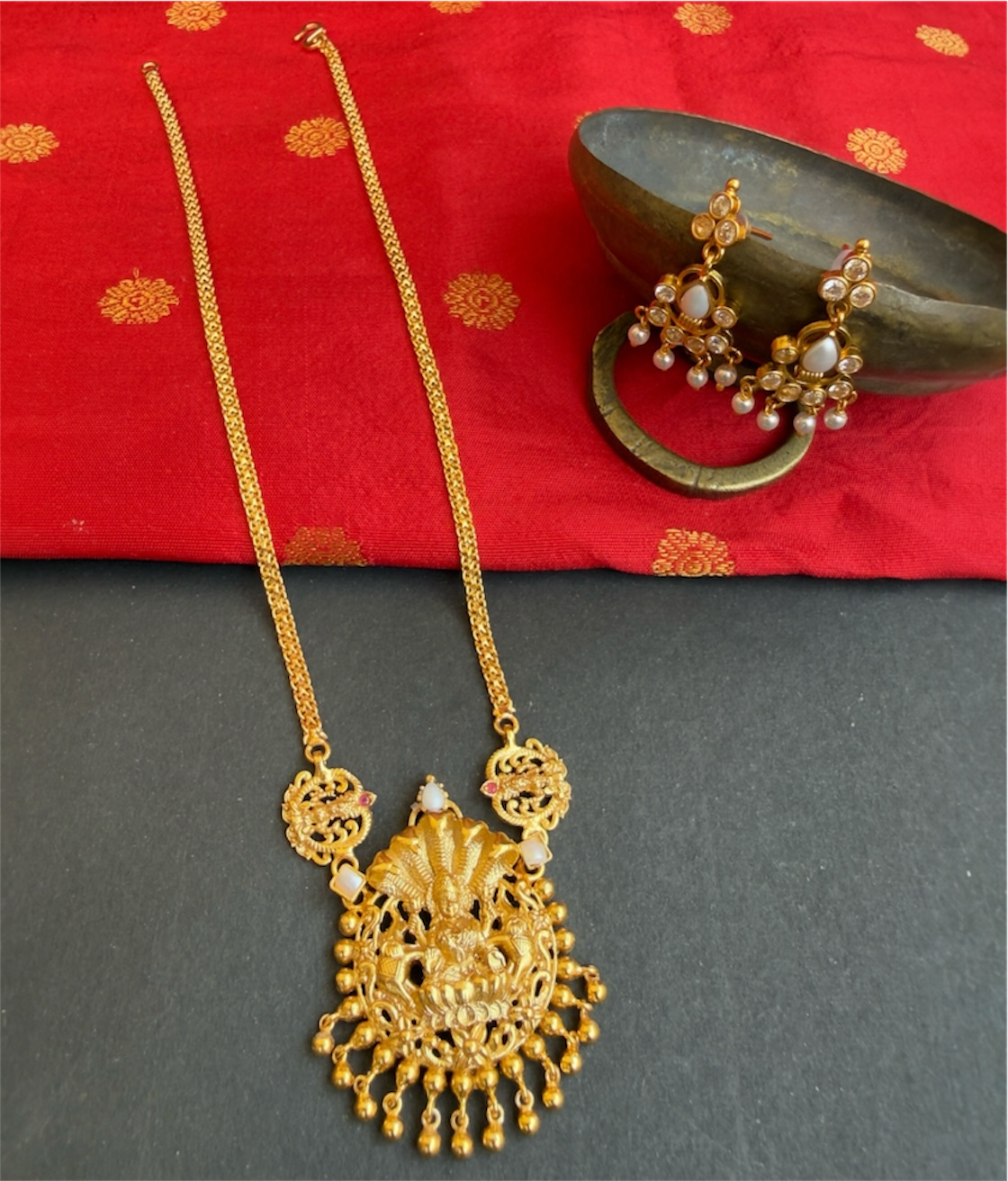 The Sriya Lakshmi Silver Pearl Necklace & Earrings- Buy Antique Temple silver jewellery online - KO Jewellery