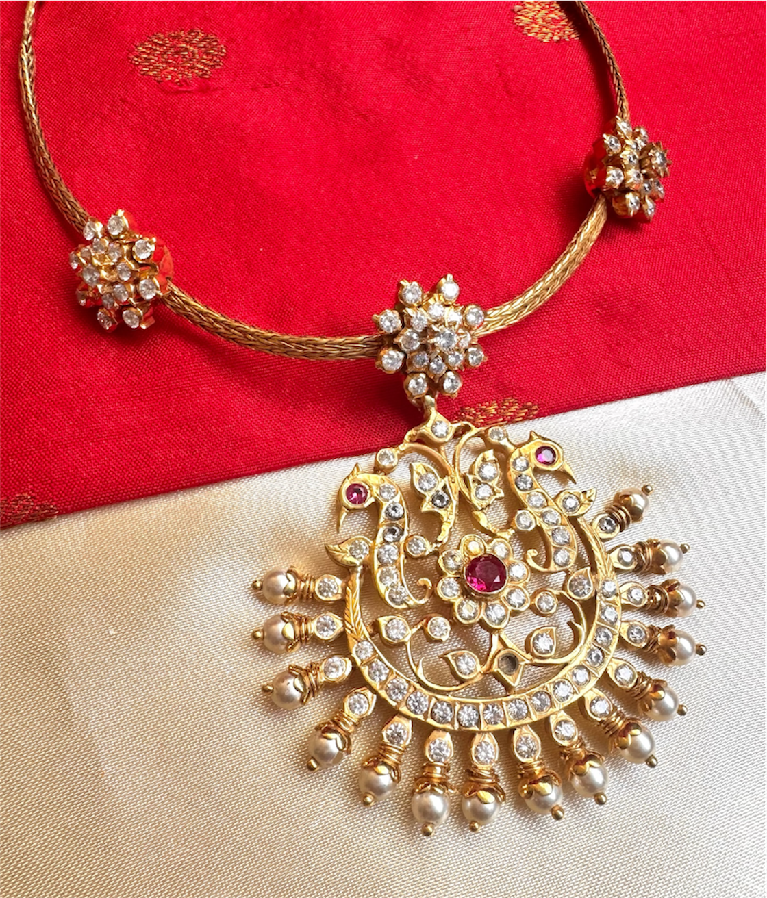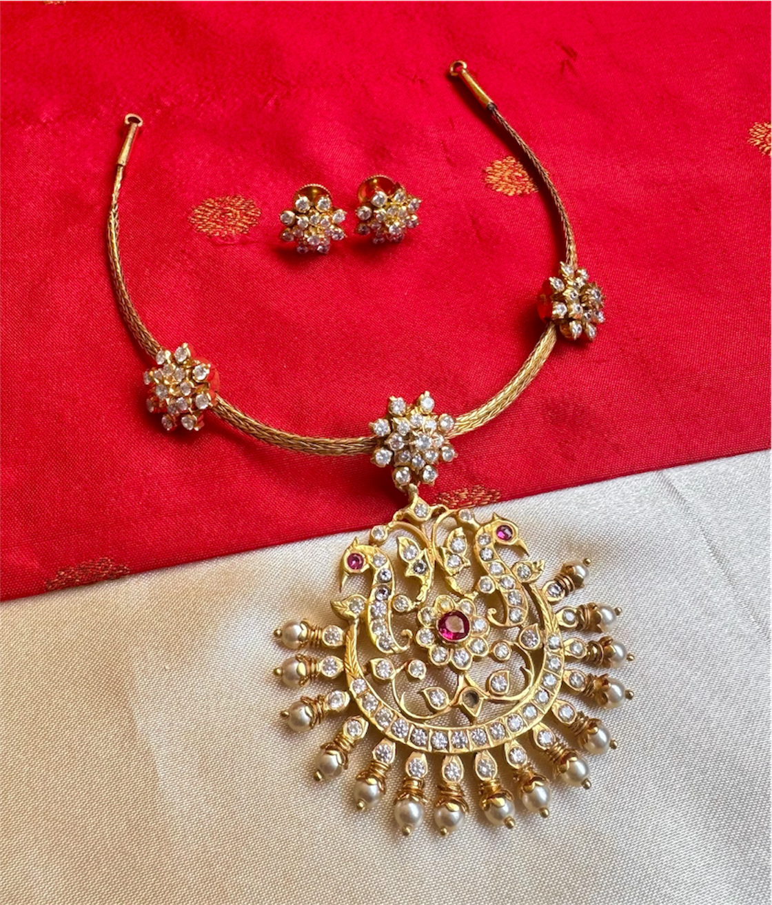 Handcrafted in pure 92.5% Sterling Silver and luxuriously dipped in 24-karat gold, the necklace undergoes a meticulous finishing process that gives it the rich appearance of solid gold. Every curve, detail, and stone setting reflects exceptional craftsmanship and attention to detail.