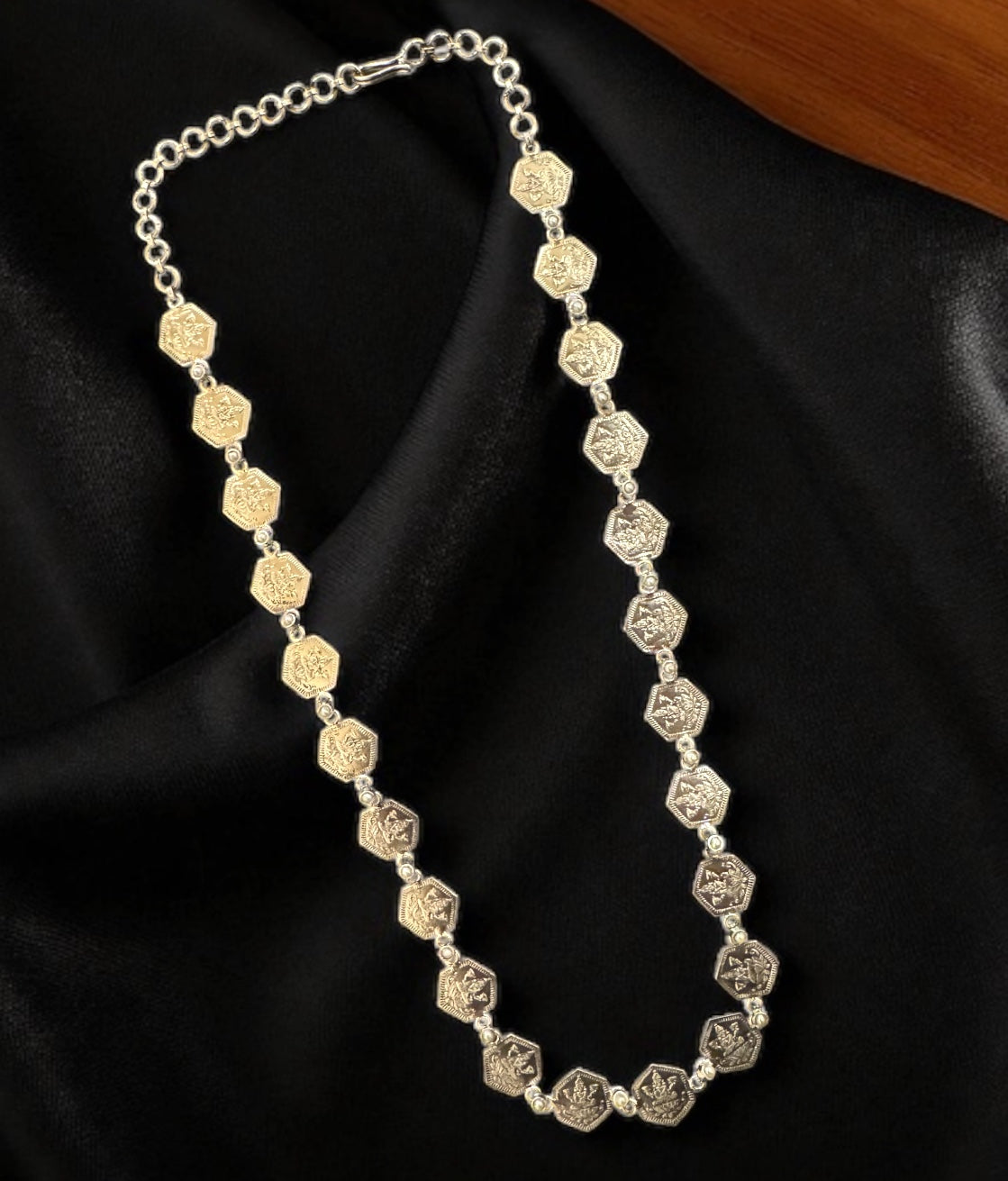 Adorn yourself with timeless elegance in this stunning Kasu Mala Necklace, an ode to divine beauty and cultural heritage. This captivating piece features a detailed engraving of Goddess Lakshmi, symbolizing prosperity and grace decorated with natural Pearl .