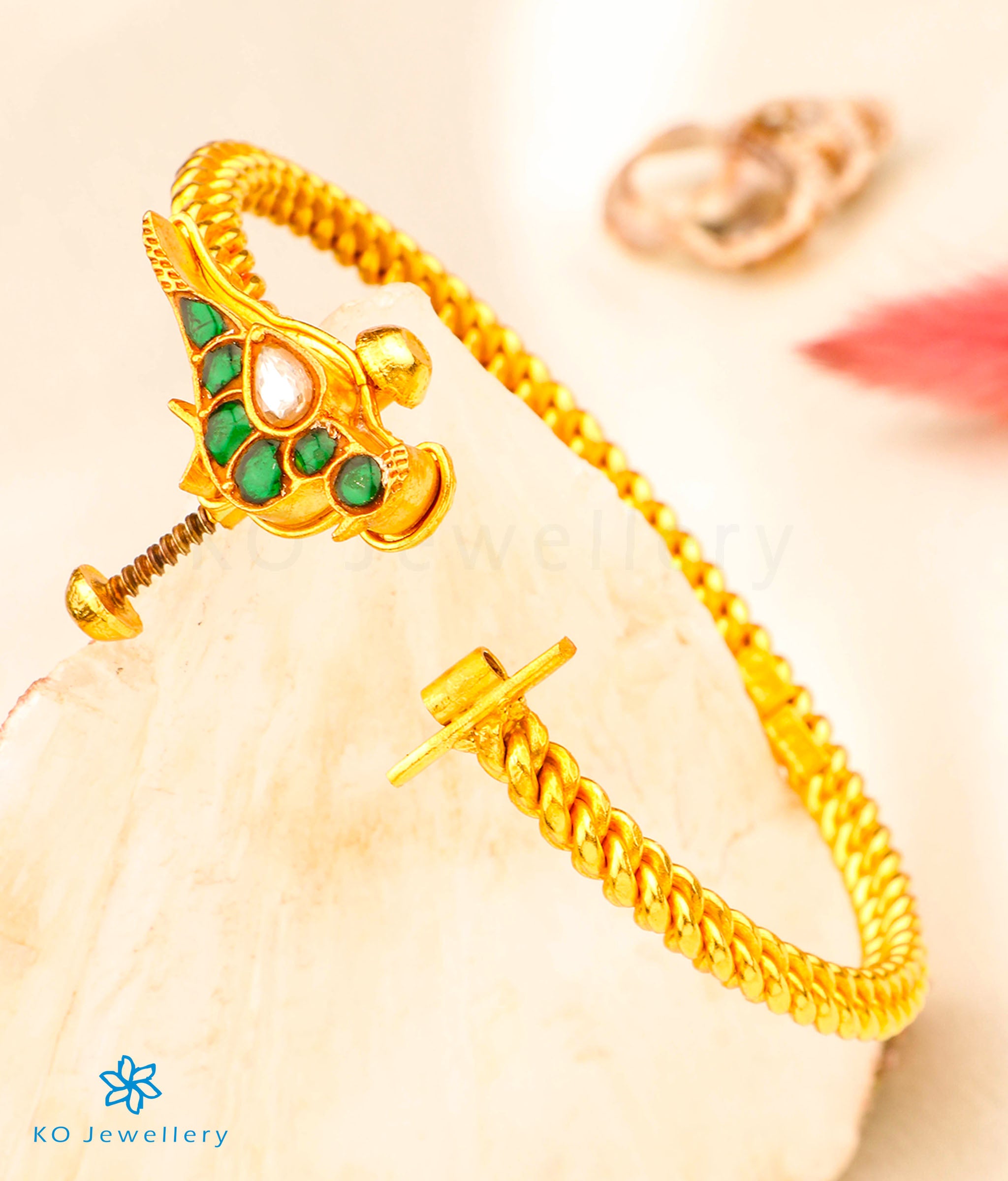 A gorgeous bracelet that is a mix of kundan and temple design ; a beautiful parrot sits at the center of a heritage temple jewellery `Golusu' bangle. The Golusu is an antique Sterling Silver (92.5%) traditional-design, twisted bangle from South India . Traditionally called a Kolusu or Golusu bangle it is made by twisting together solid silver wire with great skill and finesse. It is handcrafted using techniques used in ancient South Indian antique gold temple jewellery , the entire piece is crafted in pure silver and gold-dipped. It is an openable bangle with a screw and can fit almost all sizes.