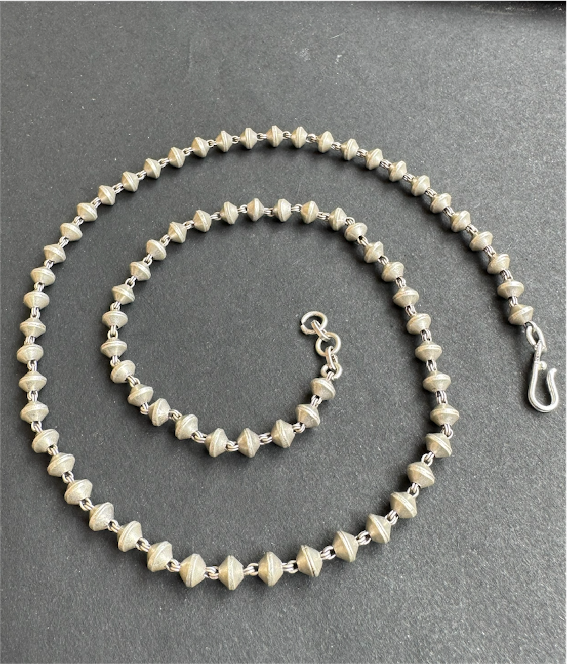A truly unique piece, this chain features handmade 925 sterling silver beads crafted in a rare traditional design that is seldom found today. Each bead is individually hand-crafted and intricately woven with silver wire, showcasing remarkable artistry and attention to detail. In this chain each bead carries a distinctive design related to forms in nature and is carefully hand-woven with silver wire, reflecting skilled craftsmanship and cultural heritage.
