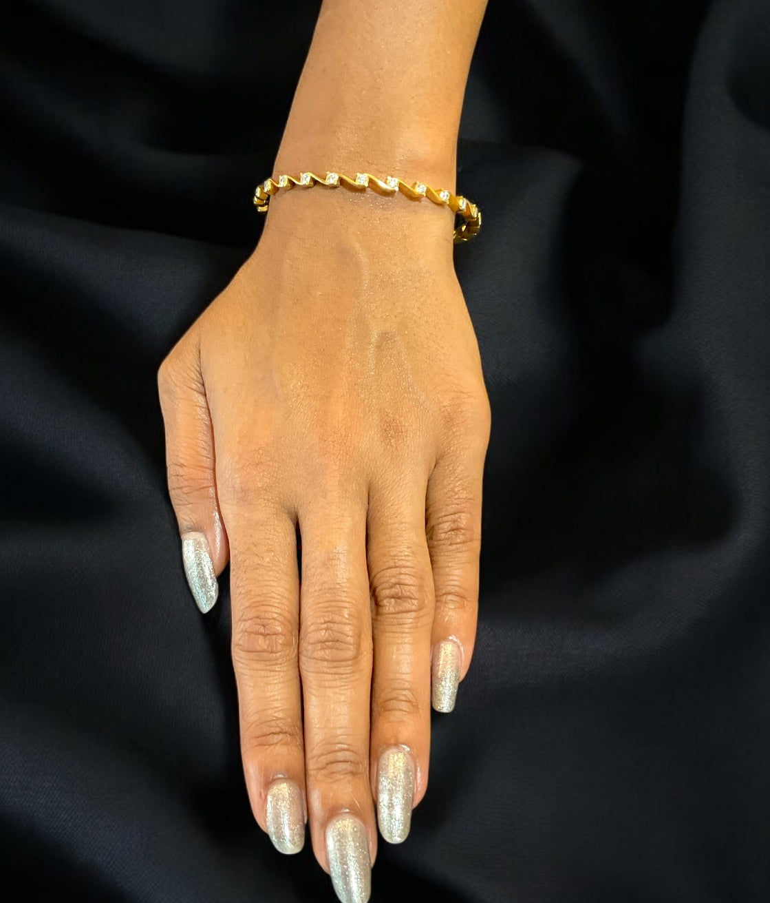 Shine like a diamond with this gorgeous , sparkling Solitaire bangle crafted using the closed method of gem setting that gives an extra sparkle to the stones, this design is truly one of a kind. Few examples of this kind of workmanship exist today .