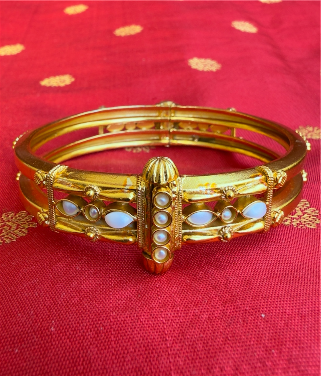 Intricate detailing paired with tiny natural pearls makes this bracelet an irresistible accessory. A signature design of Kodava traditional jewellery, it is meticulously handcrafted in Sterling Silver (92.5%) using age-old South Indian antique jewellery techniques. The bracelet is gold-dipped through a special process to achieve an authentic antique finish. Designed as a kada with a concealed screw mechanism, it can be easily opened and secured for a comfortable fit.