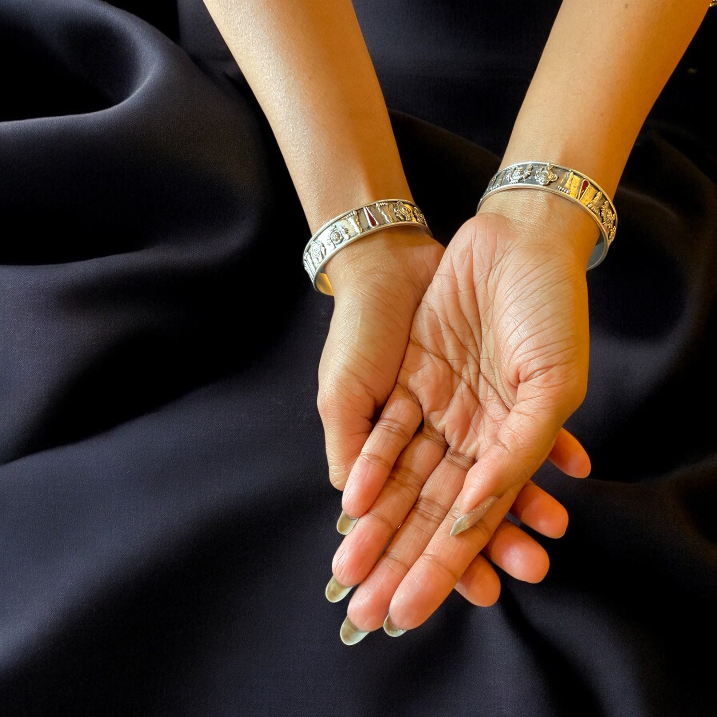 A dramatic Sterling Silver (92.5%) bangle featuring the Vaishnavite symbols of Shankhu, Chakra and Vishnupada on the surface embellished with kemp stones. Adding to the beauty of the piece are handcrafted accents placed on the bangle. Wear this bangle with ethnic wear and make heads turn wherever you go.
