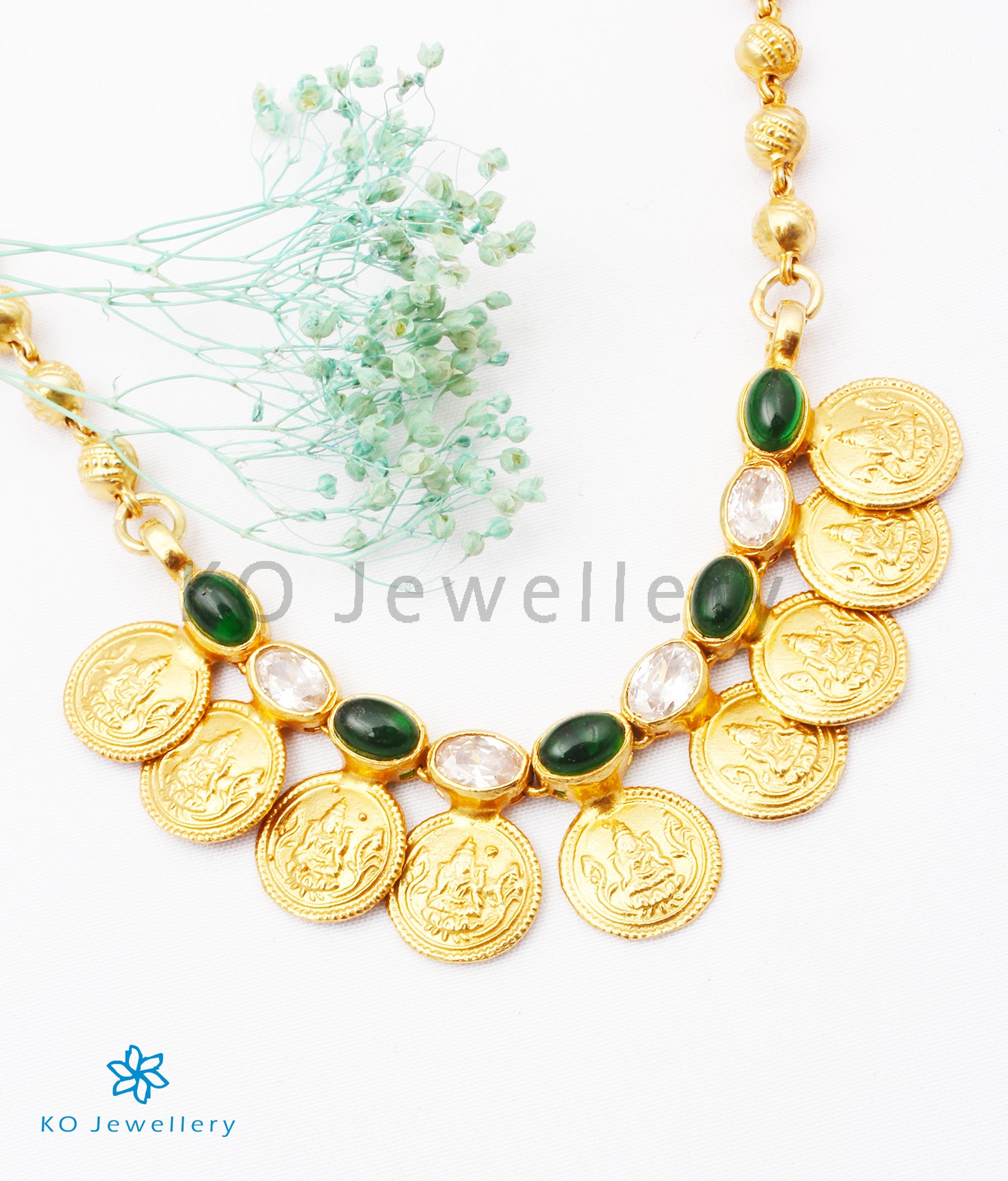Designed in the classic coin (kasu) style, this captivating necklace features a series of ornate coin pendants, each beautifully embossed with the divine motif of Goddess Lakshmi seated in grace — a symbol of prosperity, abundance, and blessings. The intricate detailing on every coin reflects exceptional craftsmanship and reverence for age-old artistry.