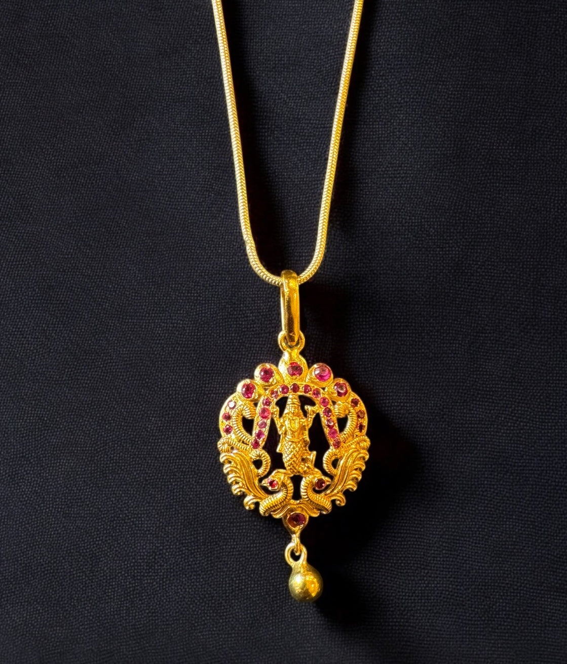 The pendant features delicate hand-carved contours that highlight Krishna’s divine form, giving it a classic temple-jewellery look with a rich, luxurious finish. The 24K gold plating adds brilliance while maintaining durability and long-lasting shine.