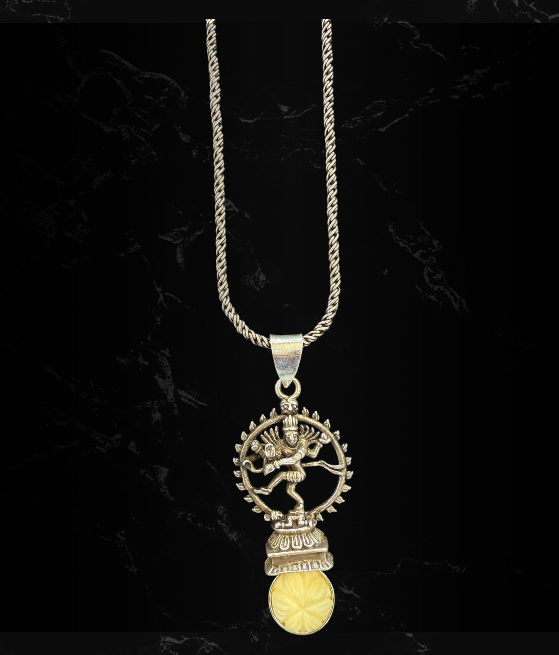 This exquisite pendant features Nataraja, Lord Shiva in his form as the divine cosmic dancer, symbolising the eternal cycle of creation, preservation, and dissolution of the universe. The rich iconography of Nataraja embodies cosmic energy and spiritual transcendence, with every element holding deep symbolic meaning.
