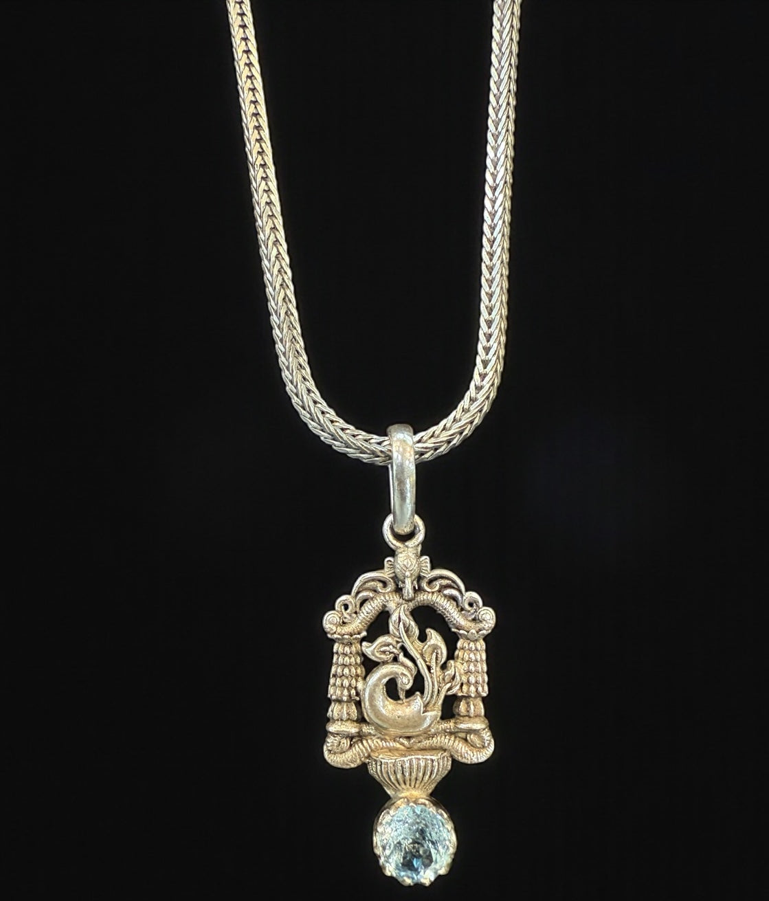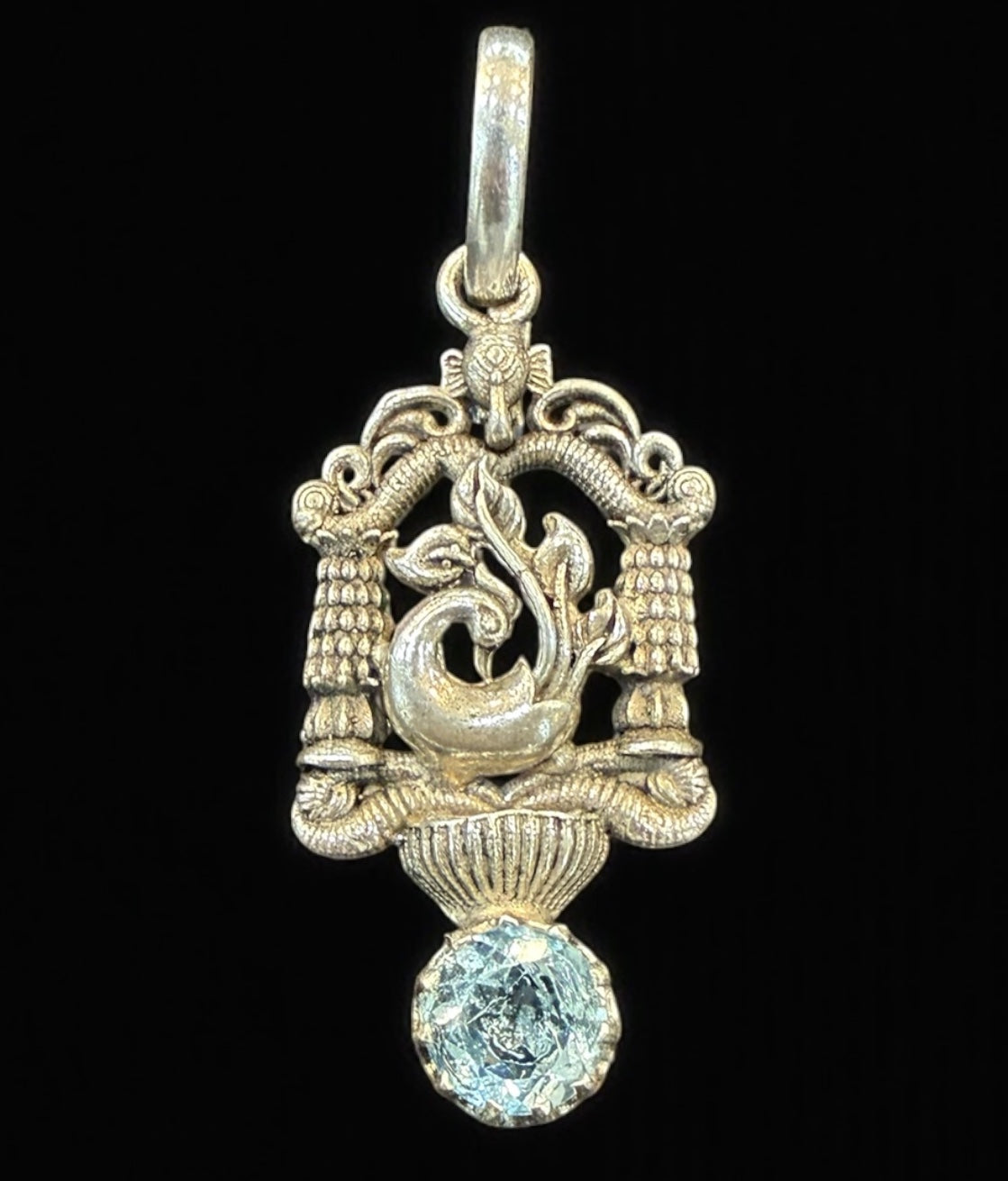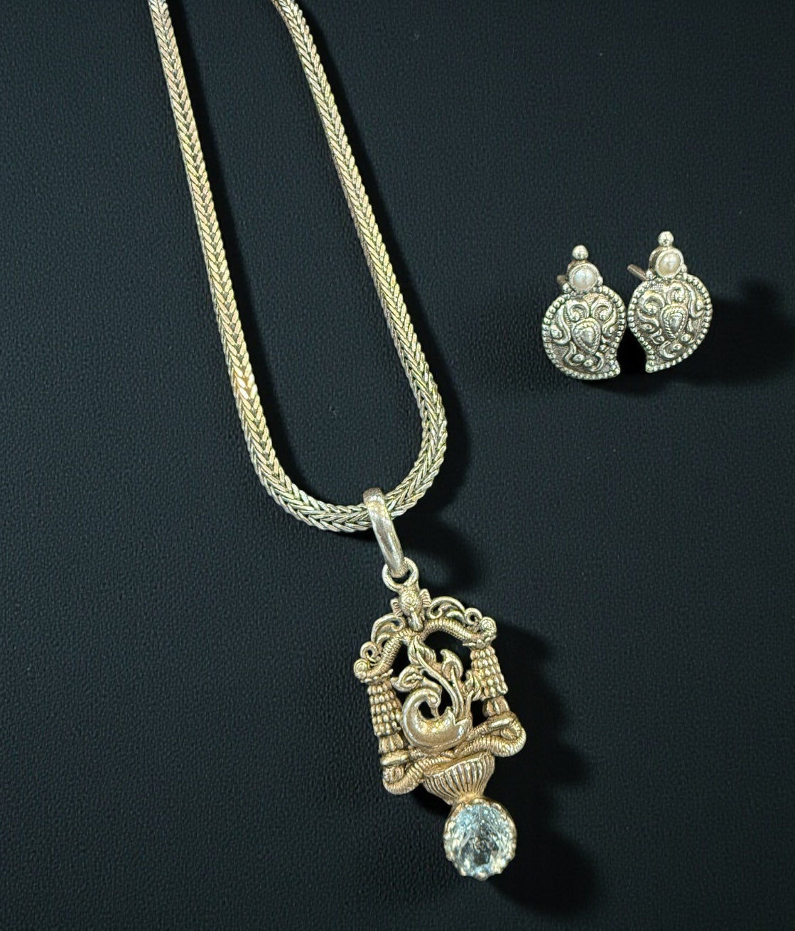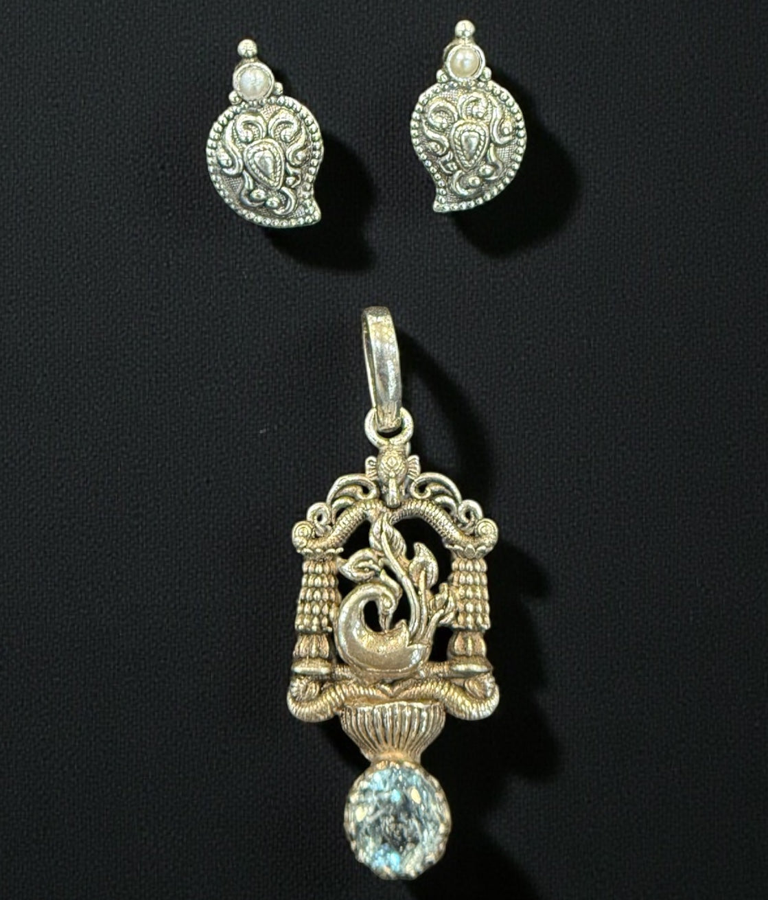 Graceful, vibrant, and crafted by hand, this beautiful set features a delicately sculpted peacock pendant paired with classic mango-motif earrings, both made in pure 92.5 sterling silver. The pendant is highlighted with a shimmering blue topaz gemstone, adding a touch of colour that enhances its elegant design.