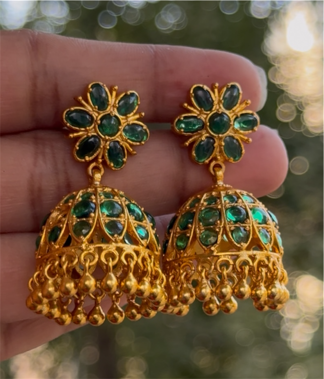 Crafted in 92.5 silver and dipped in 24k gold, this jhumka embodies the beauty of traditional South Indian design. The vibrant green kemp stones add a regal touch, celebrating the depth and colour of age-old craftsmanship.