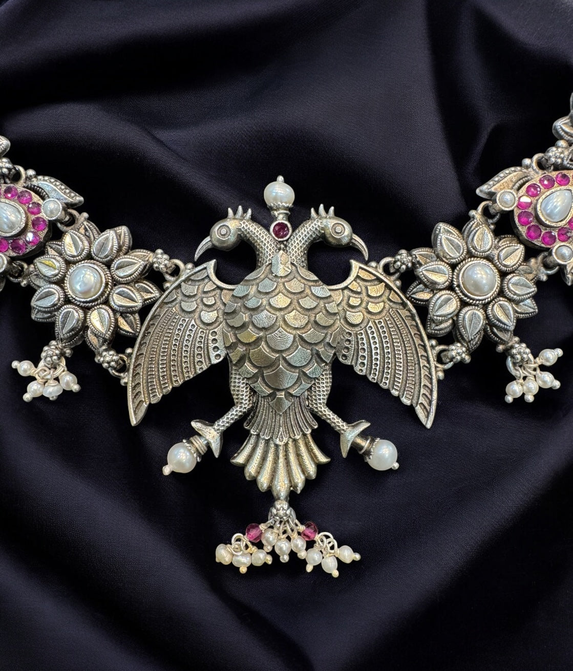 A striking piece of heritage, this handcrafted necklace features the Gandaberunda — the powerful two-headed bird from Hindu mythology, revered for its immense magical strength and ability to combat the forces of destruction. A timeless symbol of protection and power, it takes center stage in this KO original design.