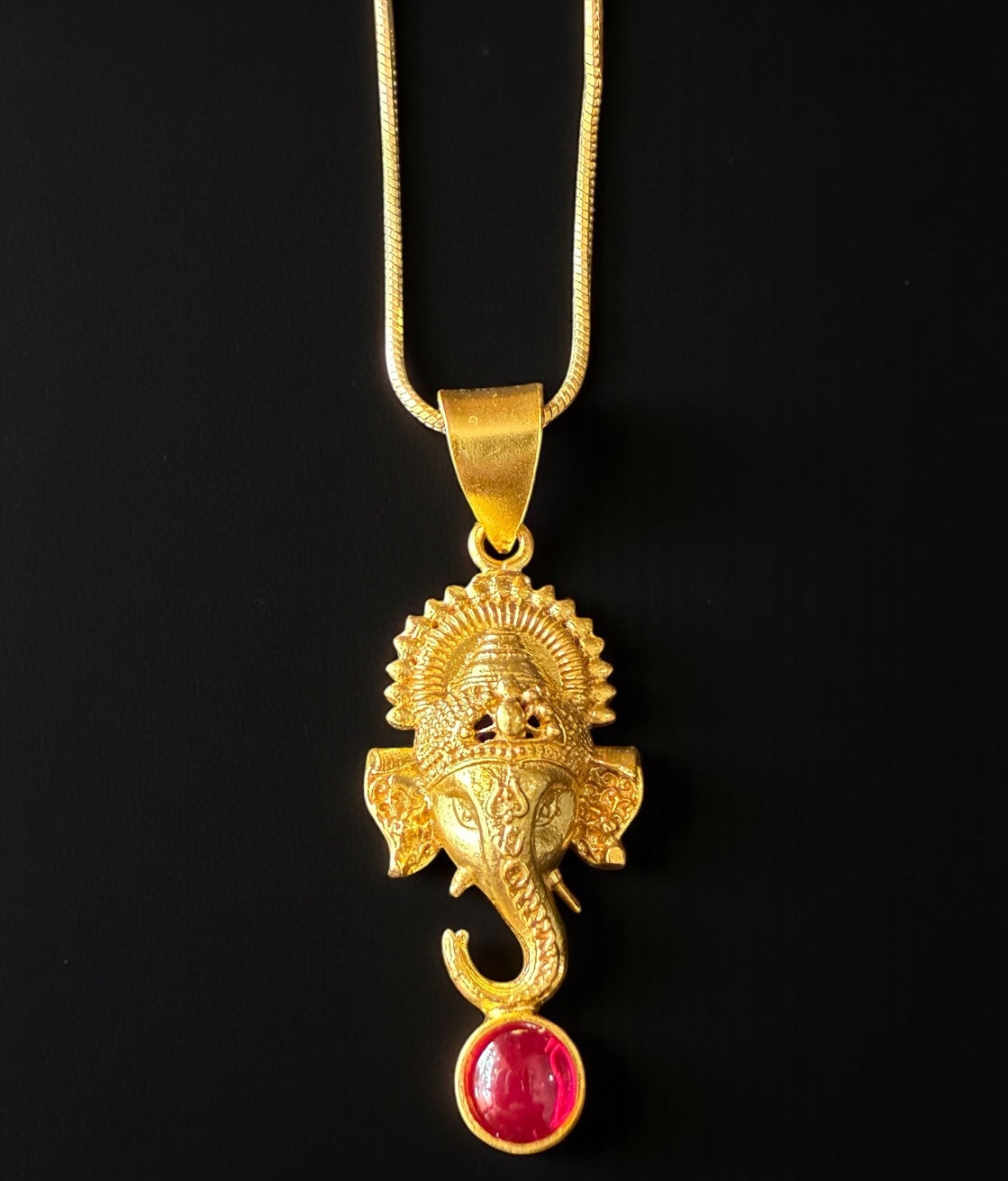 The pendant features an intricately sculpted form of Lord Ganesha, symbolizing wisdom, prosperity, and protection. Each detail is carefully hand-finished by skilled artisans, giving the piece a refined temple-jewellery character that stands out in both daily wear and festive occasions. The kemp stone adds a touch of classic beauty.