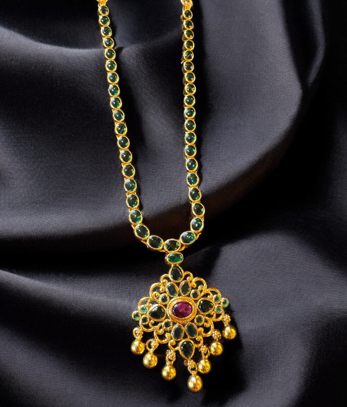 Crafted using techhniques used in ancient South Indian antique gold temple jewellery the entire piece is crafted in pure Sterling silver(92.5%) and lavishly dipped in 24K gold, the necklace boasts a rich antique finish that enhances its timeless appeal.