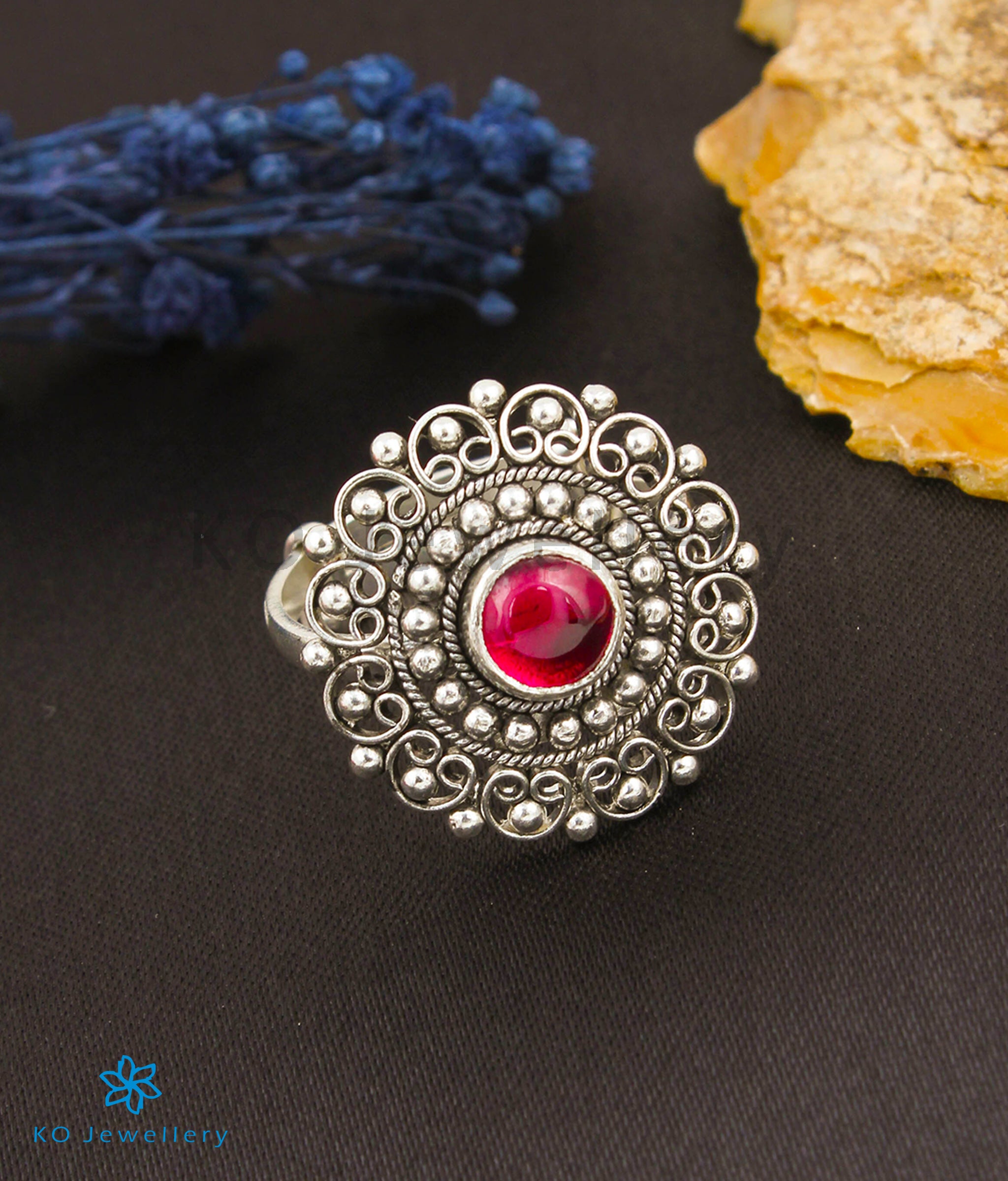 Every detail is meticulously handmade using age-old techniques once reserved for antique gold ornaments. The ring features vibrant Kempu stones and intricate filigree work, echoing the rich heritage of classical Indian jewellery.